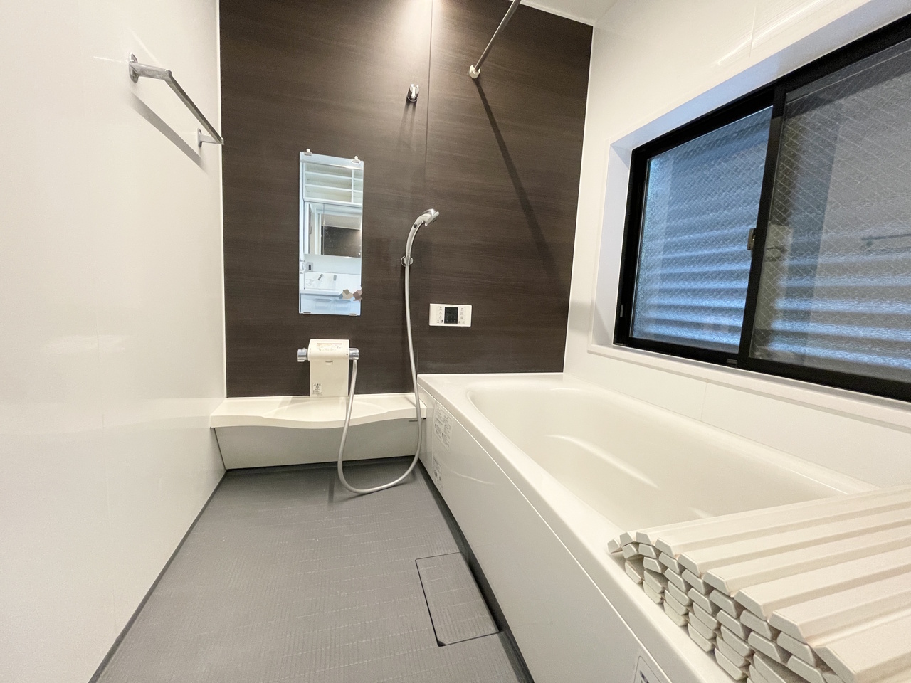 一日の疲れを癒す、窓付きのモダンバスルーム。 ダークトーンのアクセントウォールと白い浴槽が織りなす、落ち着いた空間。窓を開けて換気もバッチリ、カビの心配も軽減。足を伸ばして、心ゆくまでリラックスできる贅沢な場所です。