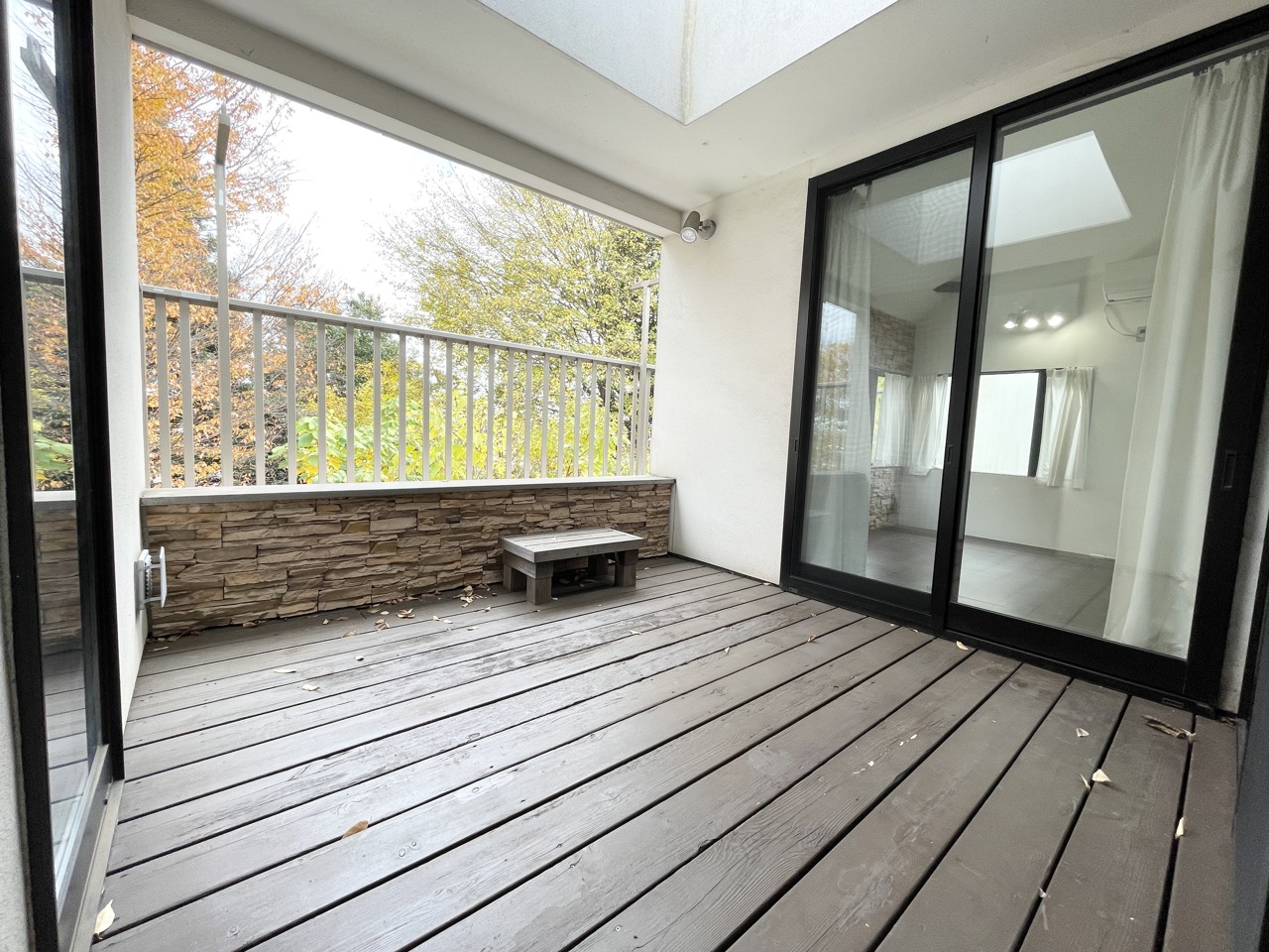 四季の移ろいを肌で感じる、リゾートライクな空間。 石積み風のアクセントウォールと、窓いっぱいに広がる自然の緑が非日常を演出。テラスと繋がる開放的な空間で、ゆったりとした時間を過ごせます。感性を磨くデザイナーズルーム。