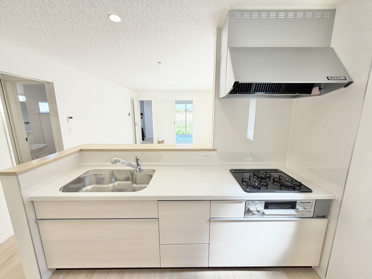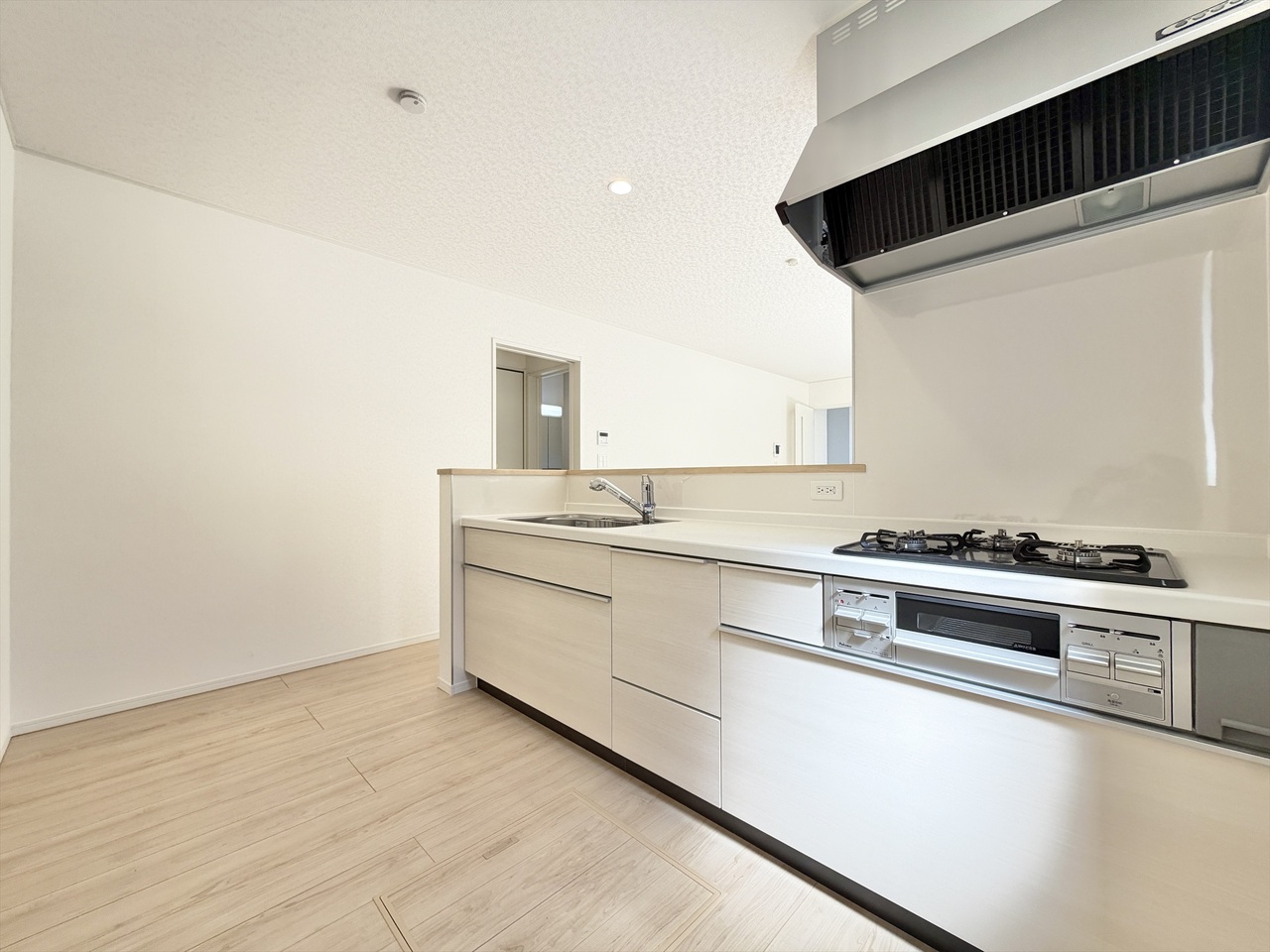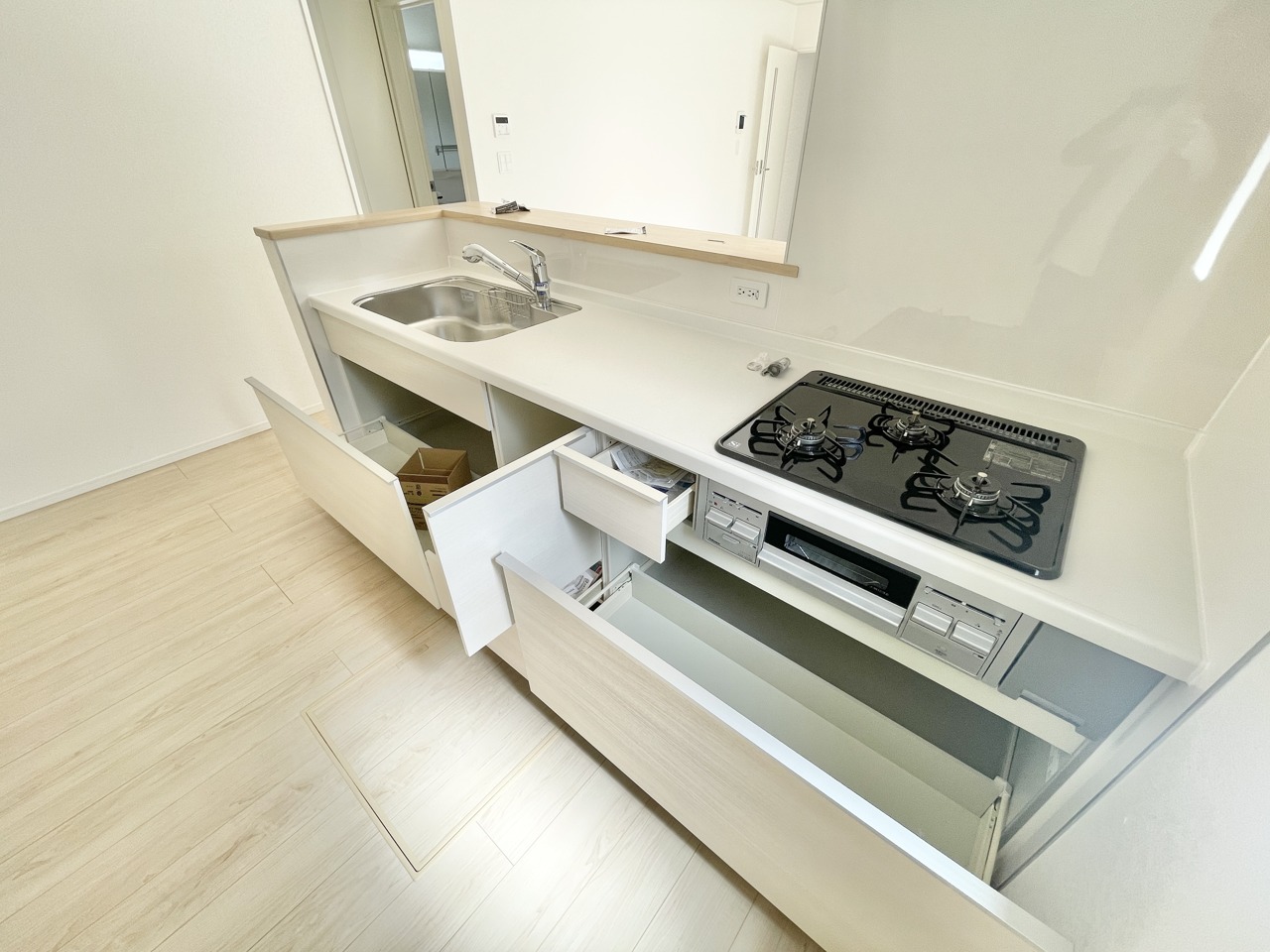 忙しい毎日を支えてくれる、新築ならではのピカピカのシステムキッチン。広々カウンターで料理も配膳もスムーズ、収納もたっぷりで片付けラクラク。家族とおしゃべりしながら作れる“ちょうどいい距離感”も魅力です。毎日のごはん作りが、ちょっと楽しみになるキッチンです。