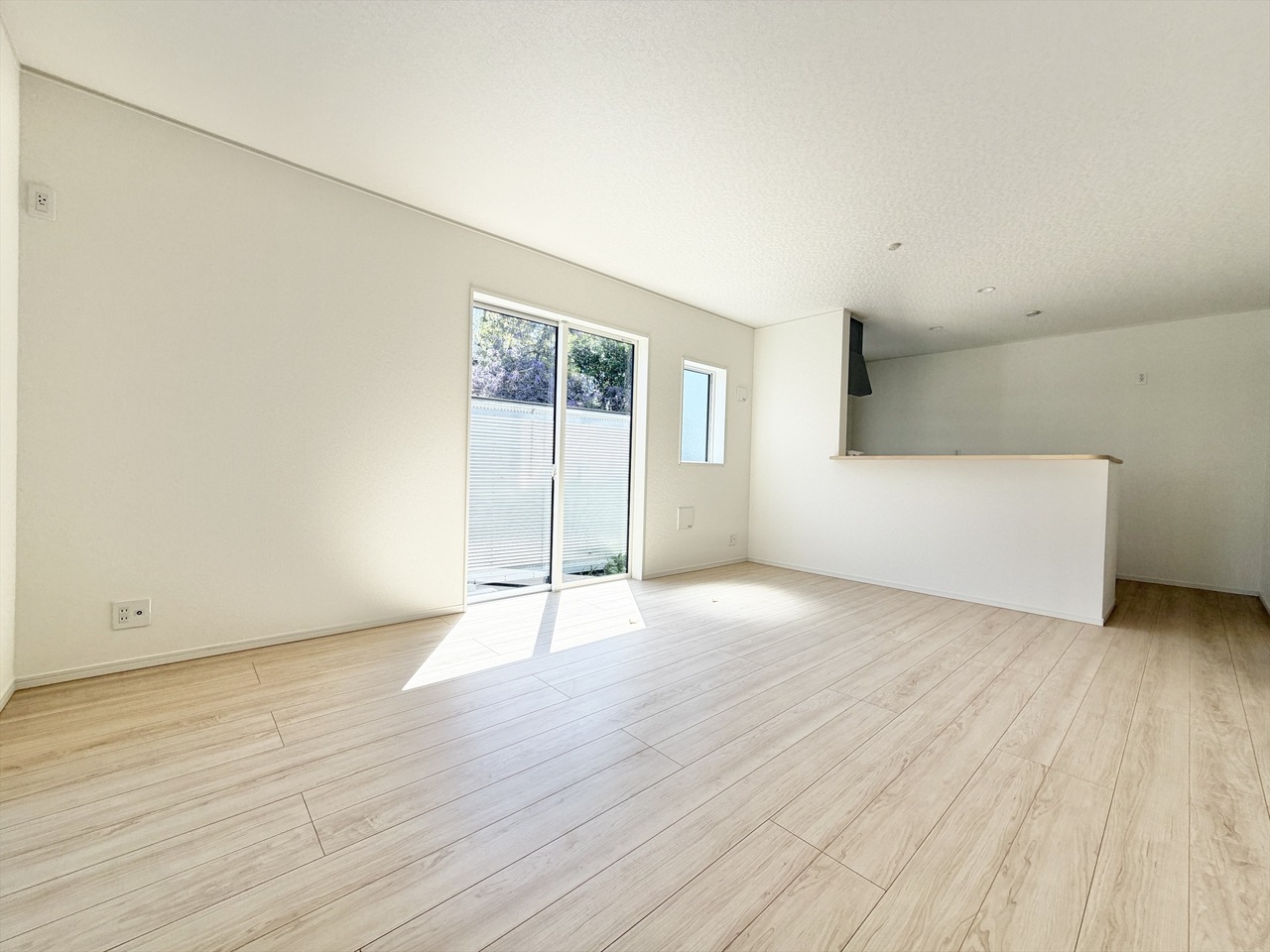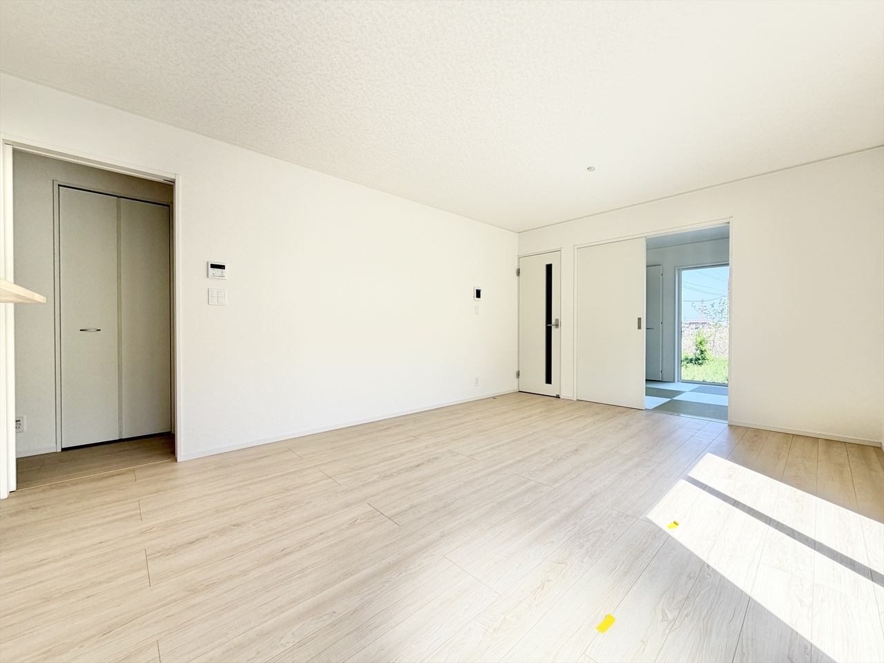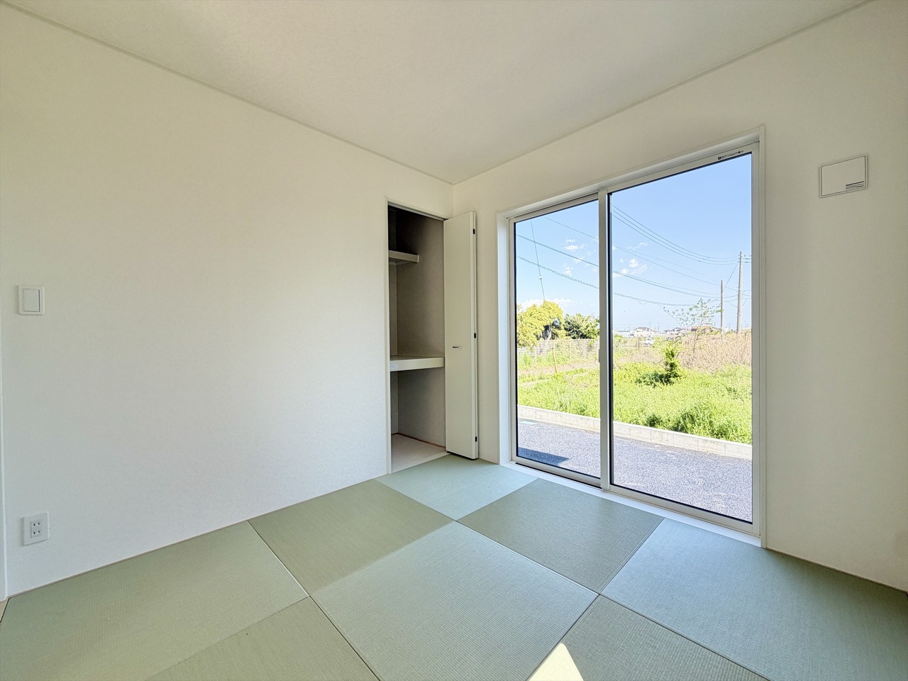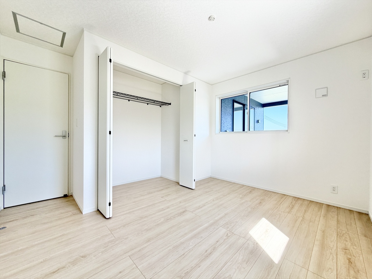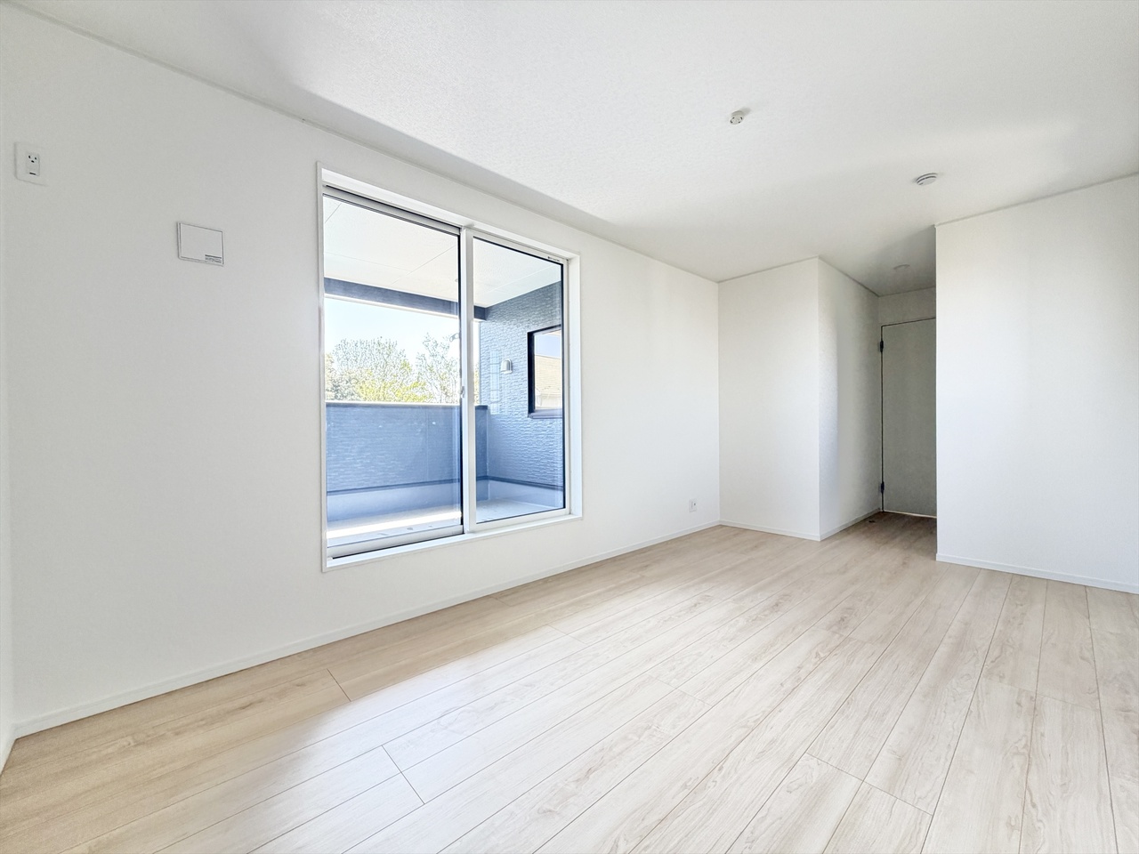 白を基調とした爽やかな空間が魅力の洋室。広めの掃き出し窓からたっぷり光が入り、日中は照明いらずの明るさです。外に視線が抜けるため、実際の広さ以上の開放感を感じられます。