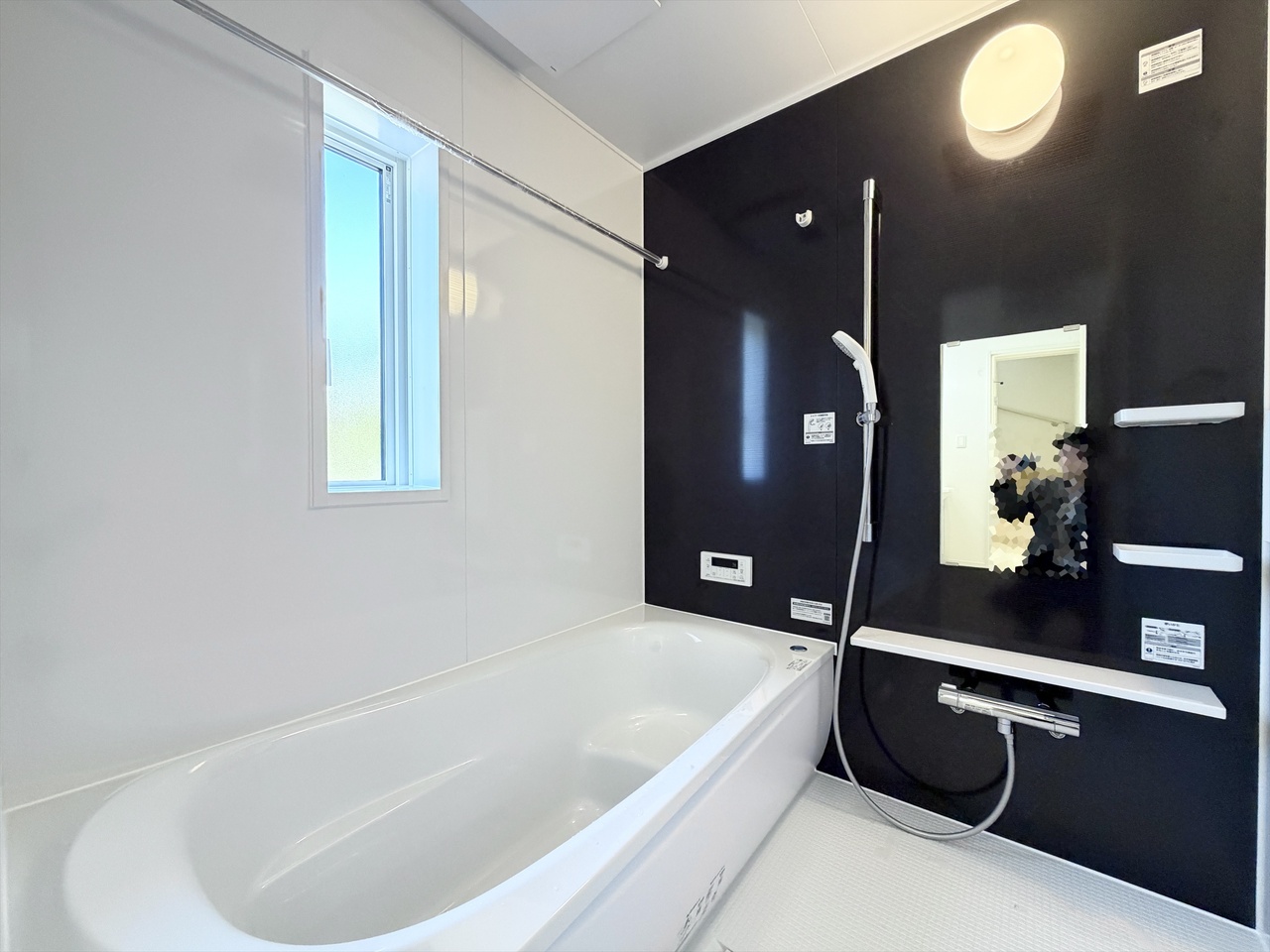 ■包み込まれるような快適さと節水を実現 ”スマートラインバス” ・プレーンフロア(断熱仕様) ・高断熱浴槽とミクロストップ ・浴室暖房換気乾燥機 (サンプル写真)