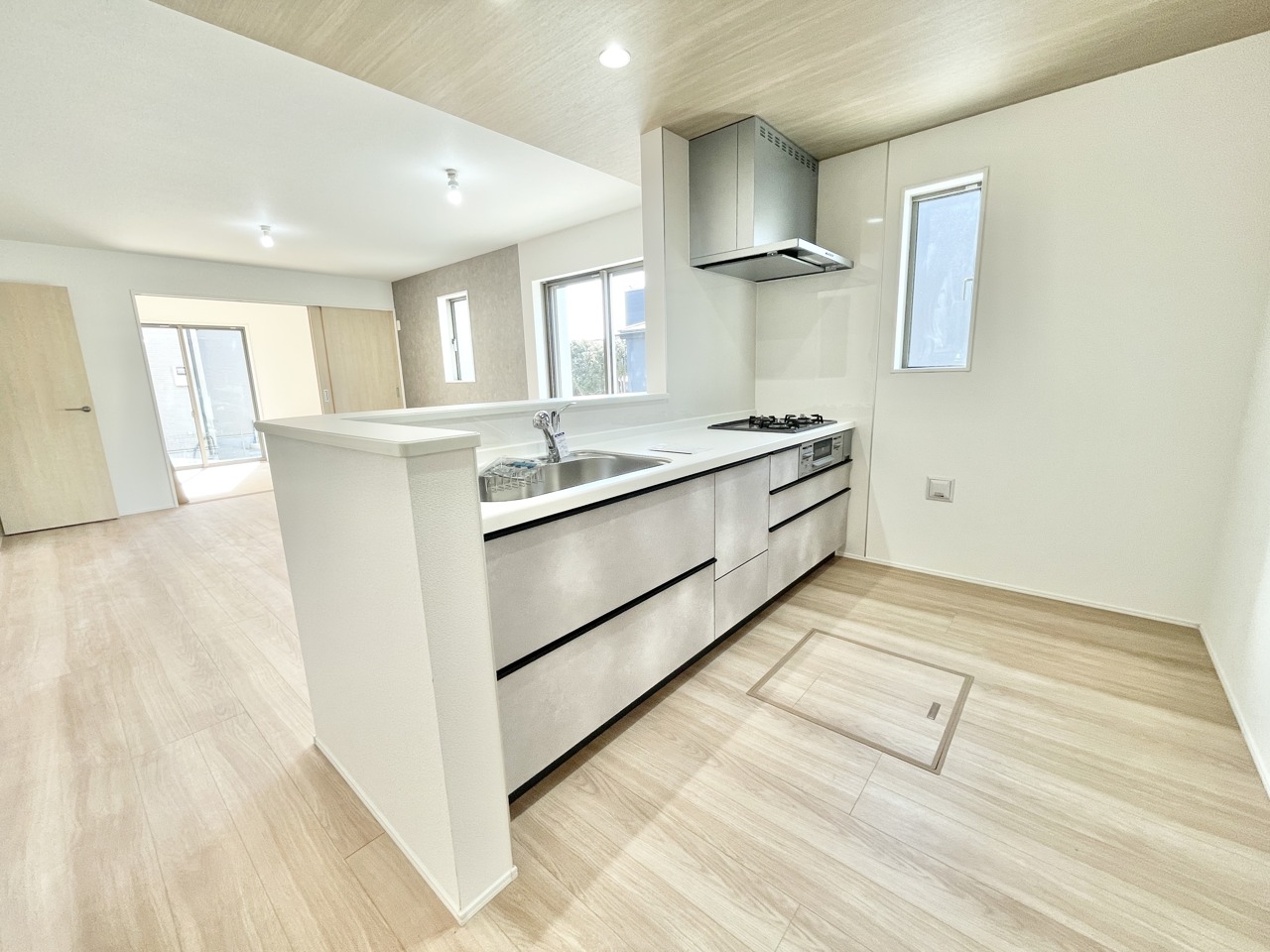 4号棟 家族の会話が自然と増える、見渡しのいい対面キッチン。明るい光が差し込むリビングで、毎日の暮らしがちょっと特別に感じられるお家です。