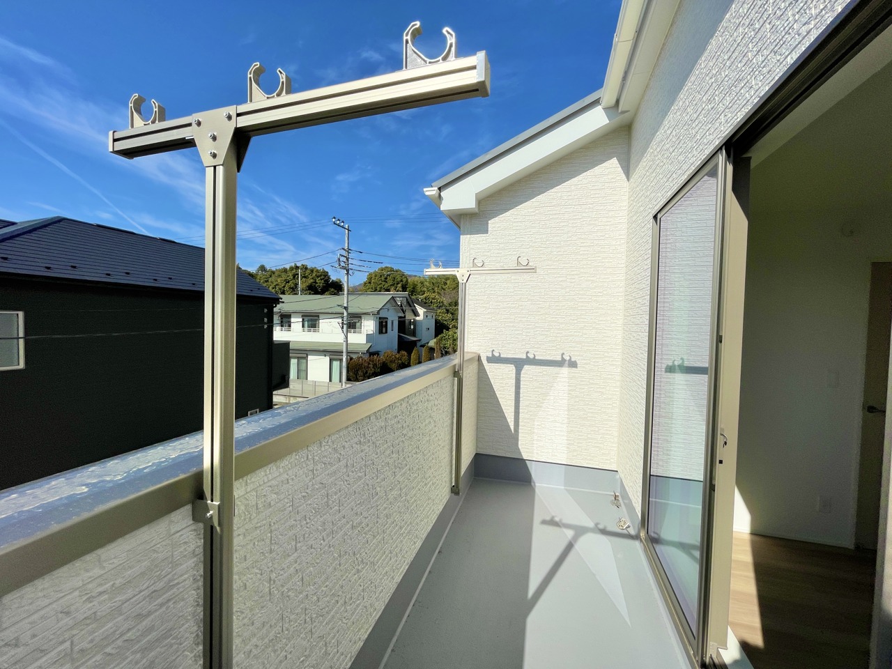 4号棟 「太陽の光をたっぷり浴びられる、気持ちいいバルコニーが魅力の一邸。洗濯物がよく乾くだけでなく、ちょっとした気分転換にもぴったり。青空を身近に感じながら、心地よい毎日を過ごせる住まいです。」