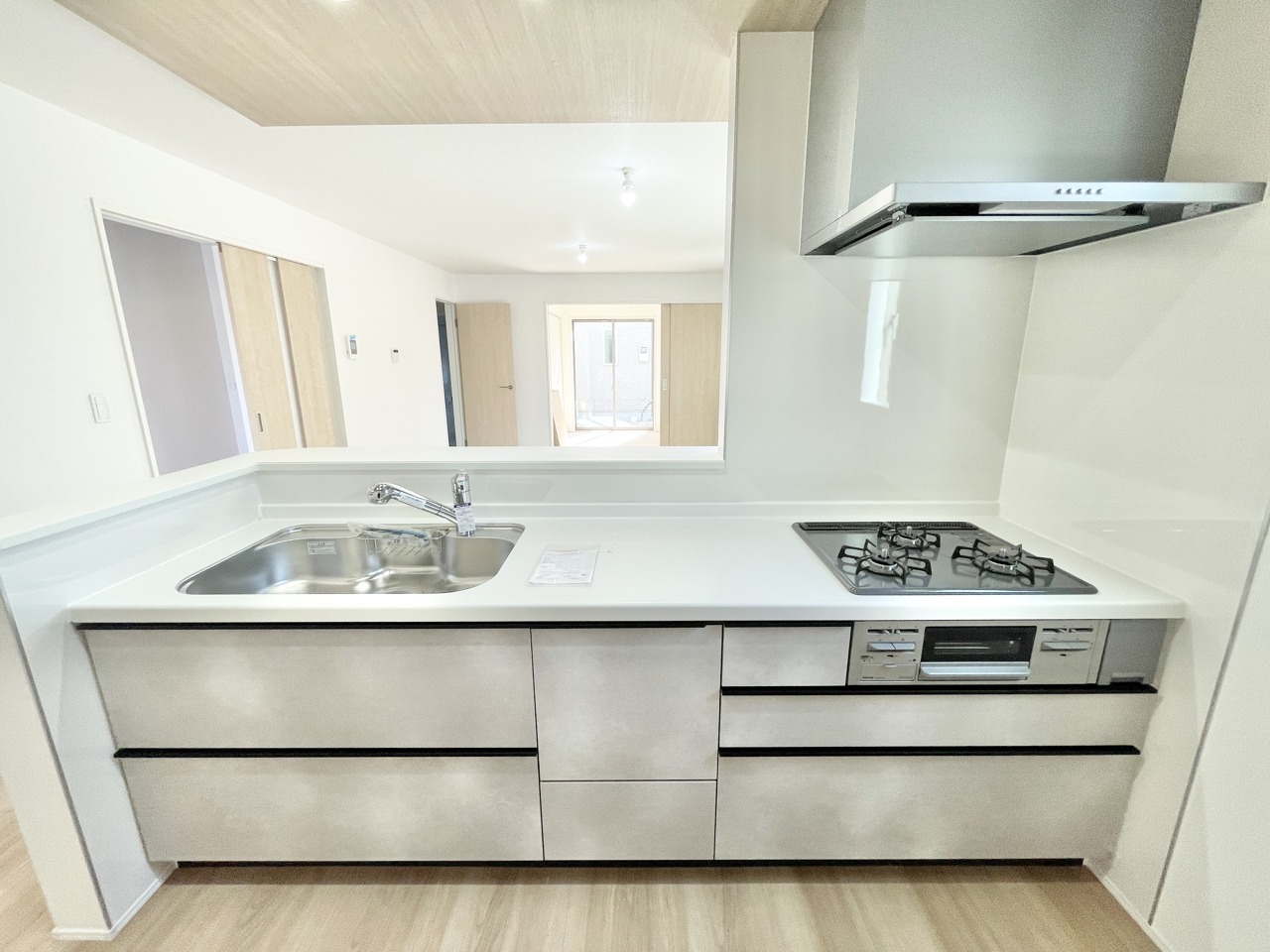 4号棟 シンクとコンロが横並びで作業効率の良いシステムキッチン。 大容量の収納と使いやすいガス3口コンロ付きで、毎日の料理が快適です。