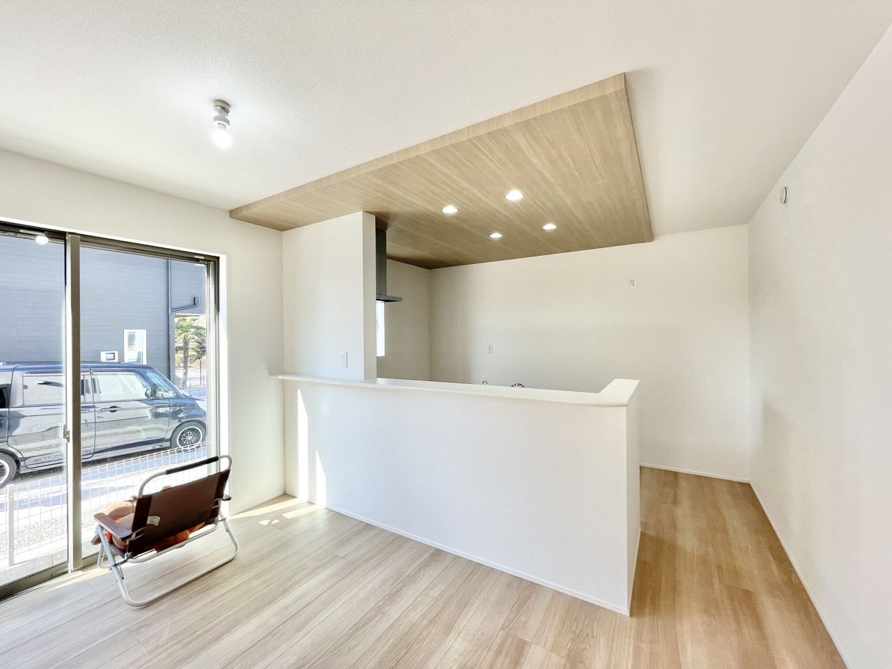 4号棟 大きな窓からたっぷり光が入る、明るく広々としたリビング。 木目調のフロアと白い壁が優しい雰囲気を演出し、家族団らんにぴったりの空間です。 キッチンとのつながりもよく、料理中も会話が楽しめるオープンな間取りです。 2026/02/14m