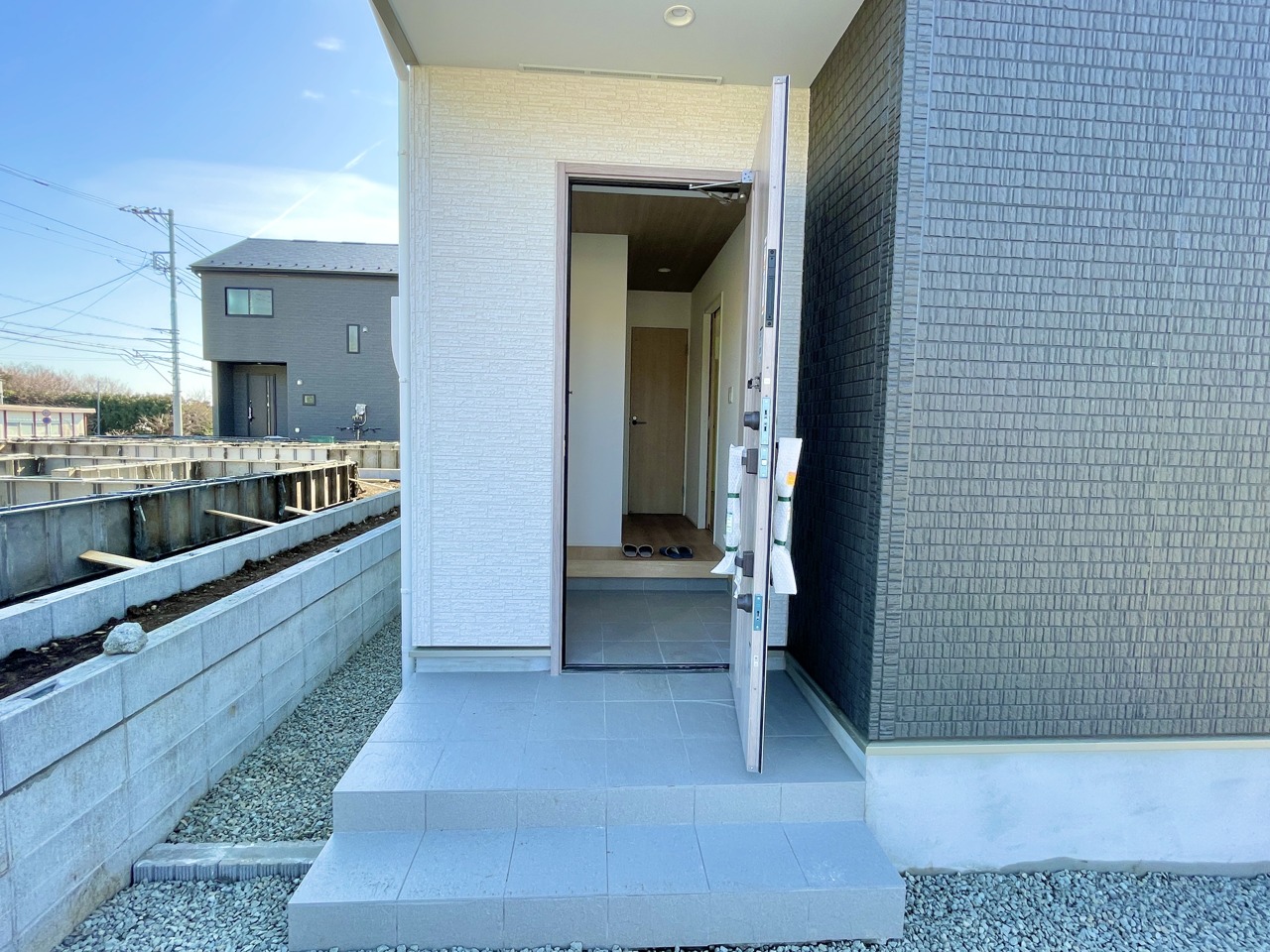 4号棟 明るい玄関にたっぷり収納のシューズクローク付きで、いつでもスッキリお出迎え♪ 家に帰るたび気持ちが整う、家族みんなに優しい住まいです。 2026/02/14m