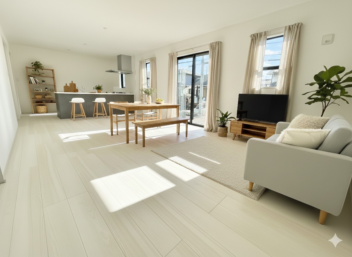 1号棟 開放感あるリビングは、上質な空間設計が魅力。自然光がたっぷり差し込む心地よい空間で、贅沢なくつろぎの時間を演出します。