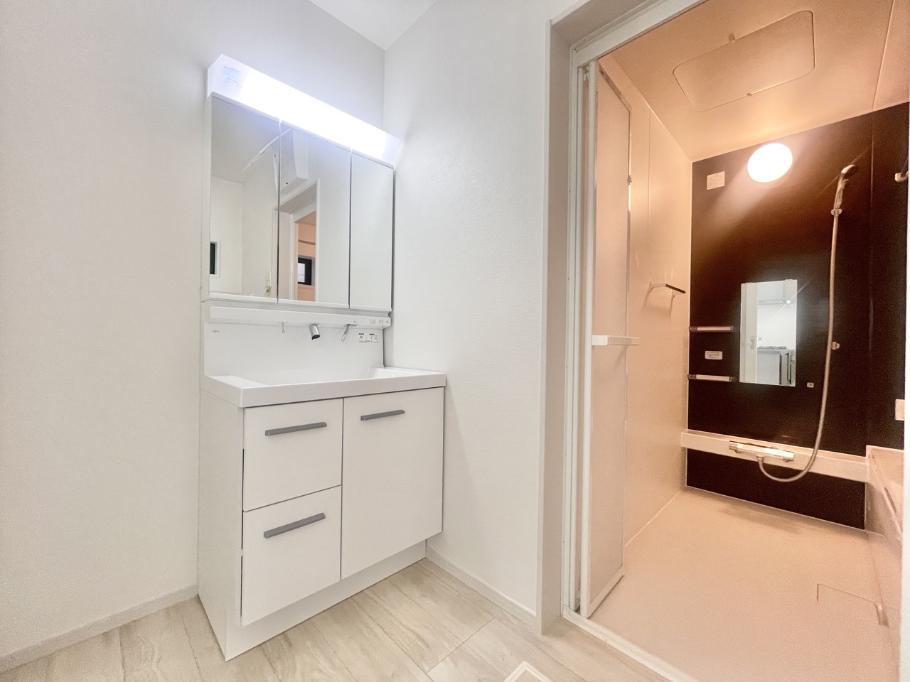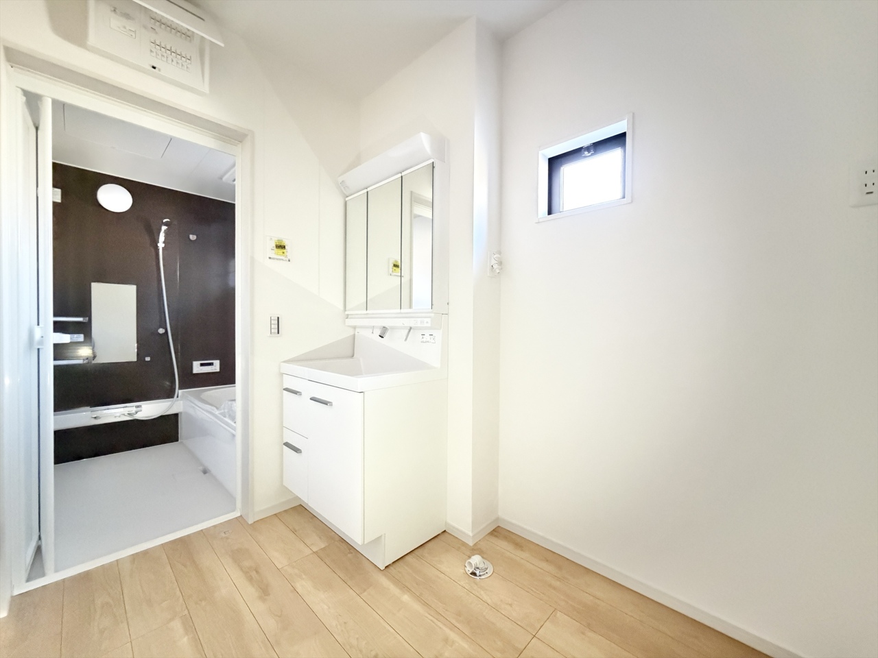 2号棟 ゆとりある空間の洗面化粧台スペース。大型の洗濯機も置くことが可能です。