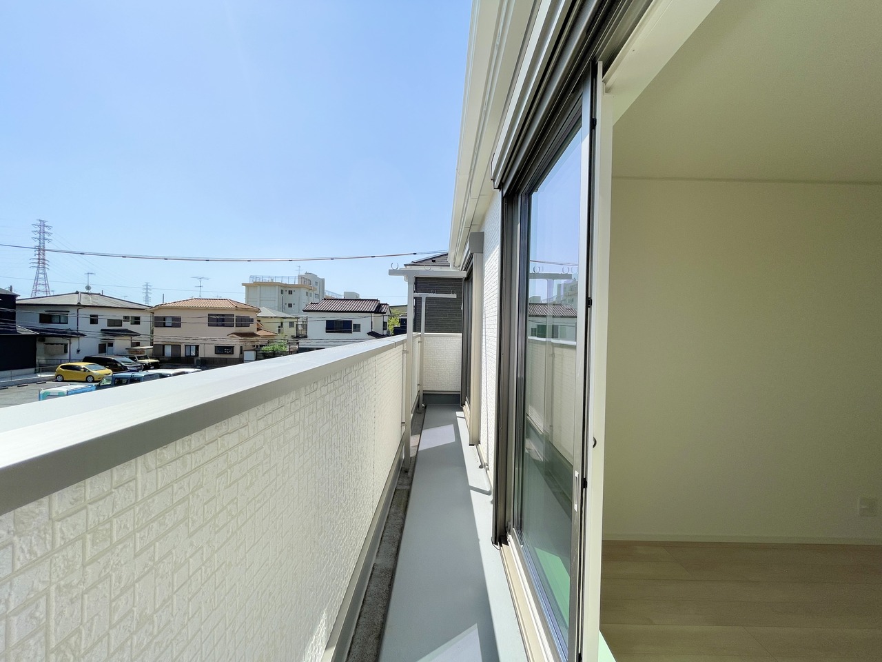 たっぷりと陽が入るバルコニーは、洗濯物がよく乾くだけでなく、外の開放感を感じながらリラックスできる空間です。 柵がしっかりとした造りで安心感があり、隣室からそのまま出入りできる使い勝手の良い仕様。 バルコニーからは周辺が見渡せ、圧迫感のない眺望が魅力です。