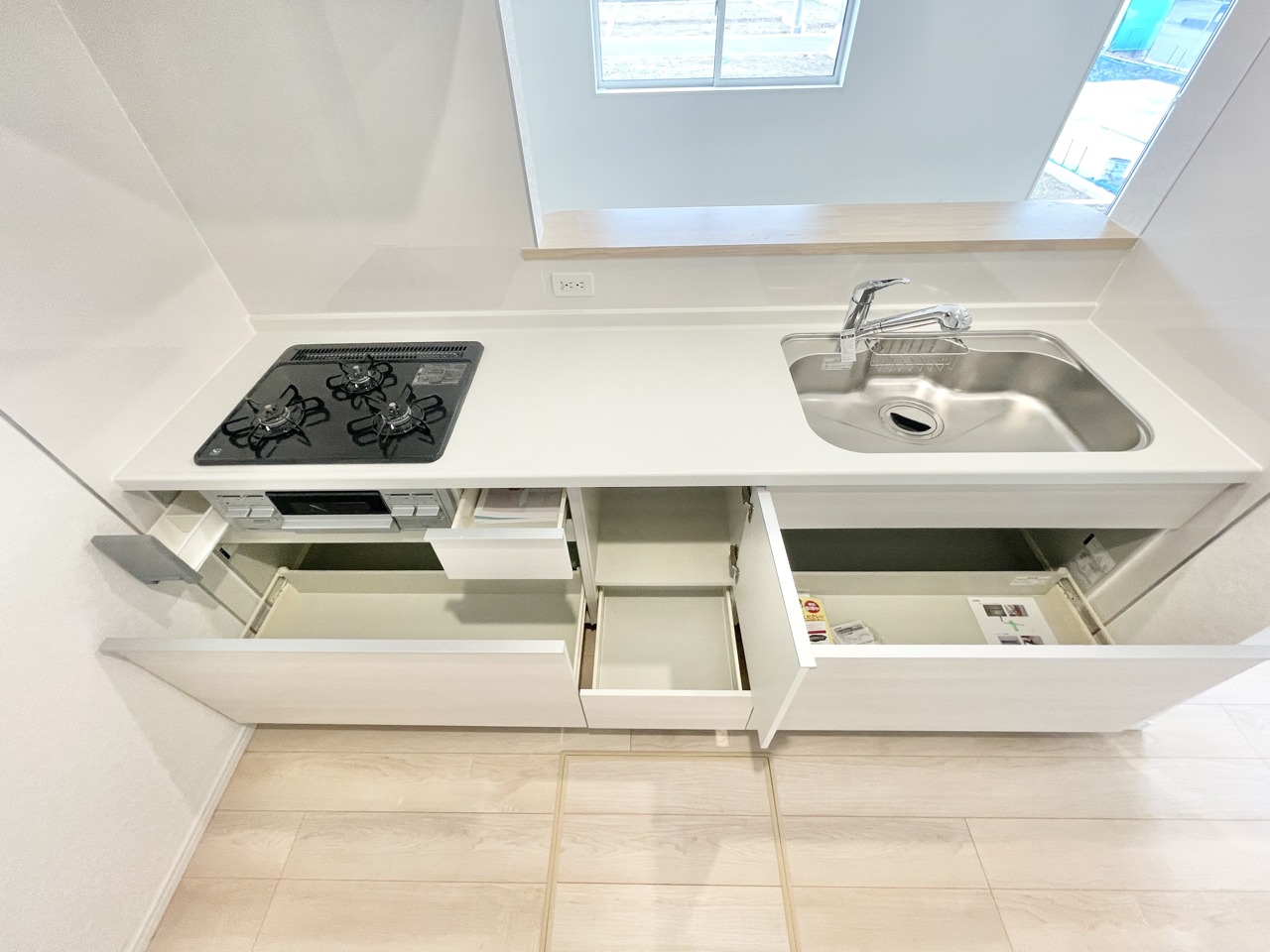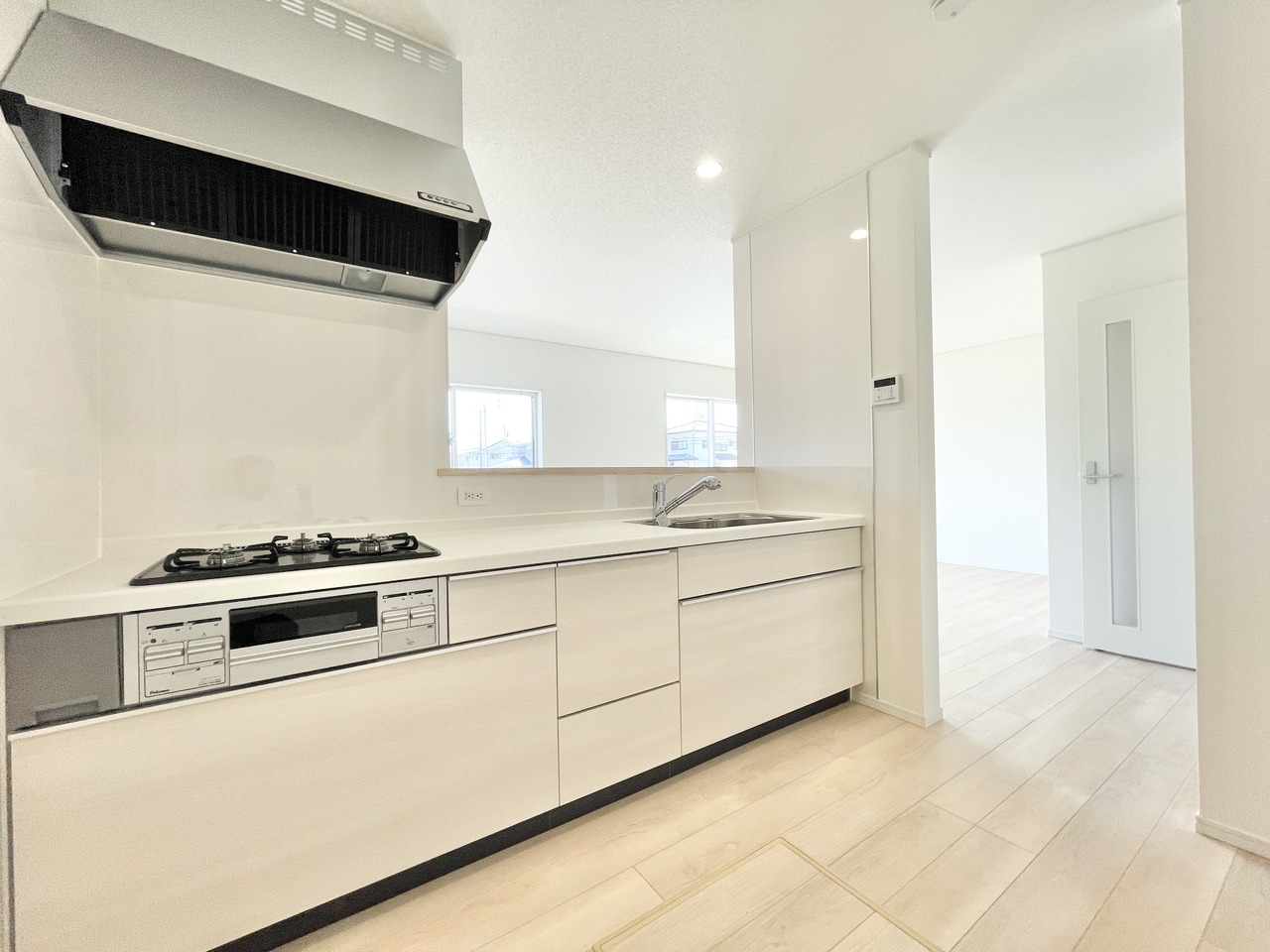 家族みんなが自然と集まる、開放感あふれるオープンキッチン。使いやすさとおしゃれさを両立した空間で、毎日の料理がもっと楽しくなる住まいです。