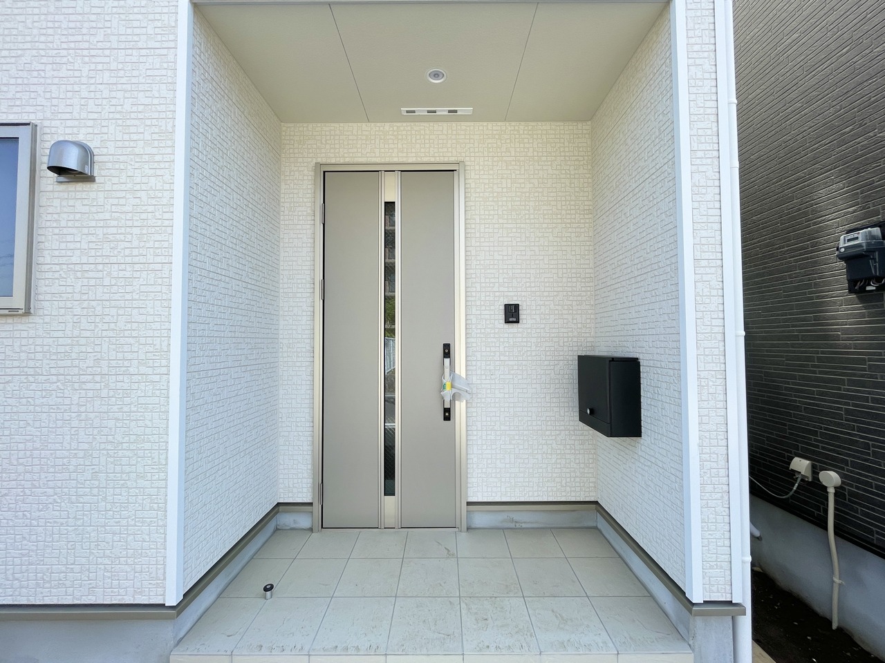 屋根付き玄関で雨にも濡れないで、玄関が明けられます。 スマートキー採用