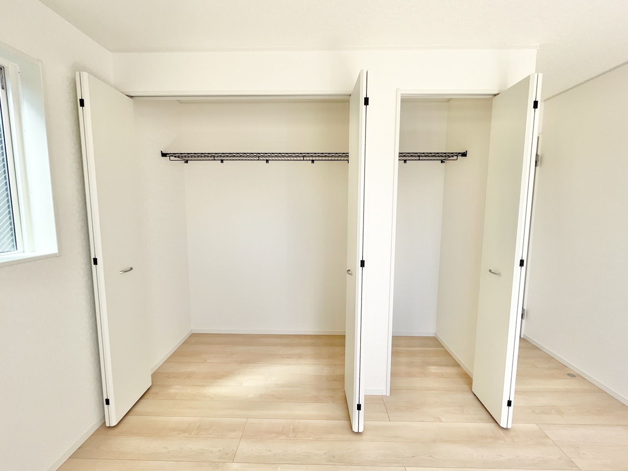 ■クローゼット ハンガーポールと枕棚付きのクローゼット 洋服をいっぱいしまったり、枕棚の上には、あまり使用しないものの収納もできます。 枕棚の耐荷重も40キログラムあり、多くのものが収納出来ます。
