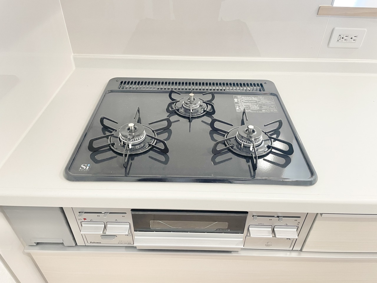 角を極力少なくした、お手入れのしやすい「すっきりクリーンごとく」。3口全てに温度センサーが付き、高温炒め機能付き。片面焼きグリルも搭載しています。消し忘れ消火機能付き、安全で機能的なガスコンロです。