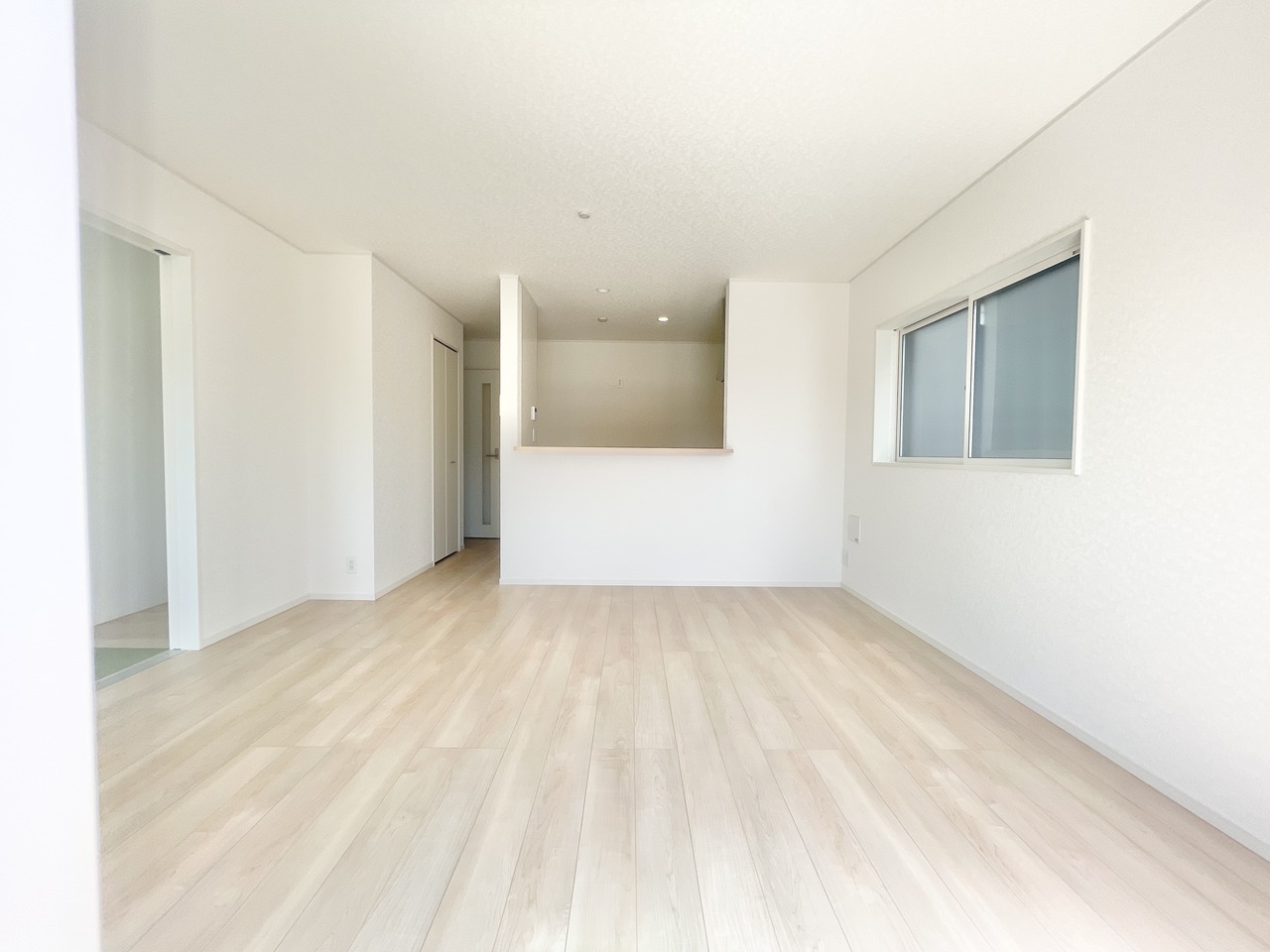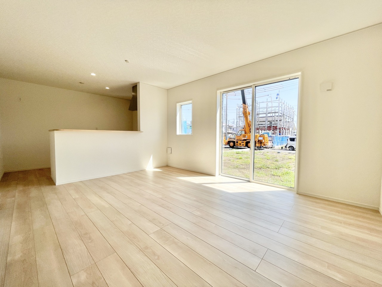 4号棟 視界が広がるワイドなリビング空間は、小さなお子様がいても見守りやすい設計。キッチンからもリビングを見渡せ、家族の気配を感じながら家事ができます。