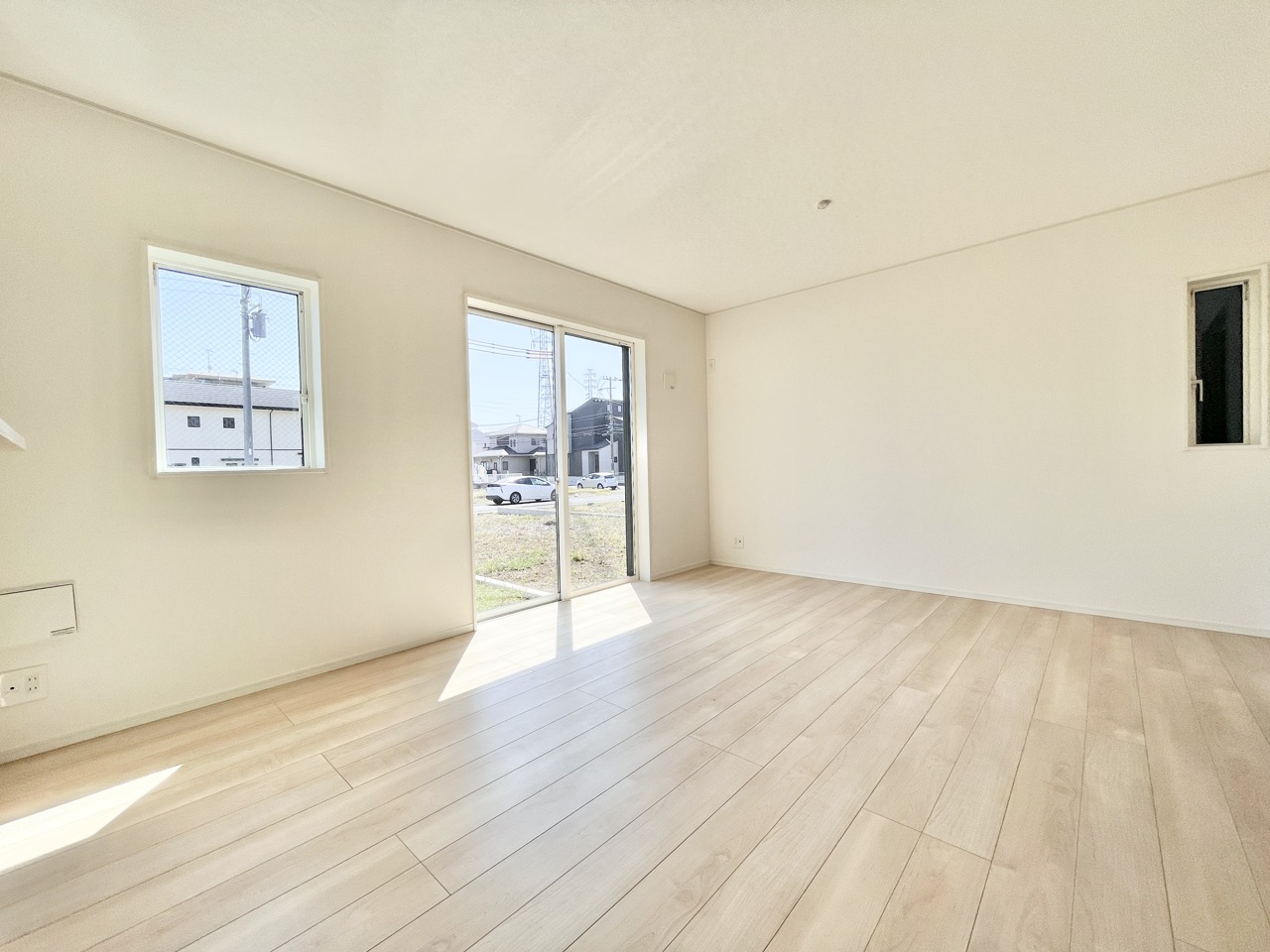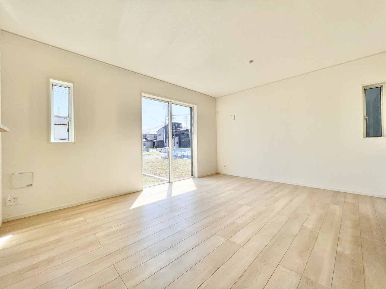 1号棟 白を基調とした爽やかな空間が魅力の洋室。広めの掃き出し窓からたっぷり光が入り、日中は照明いらずの明るさです。外に視線が抜けるため、実際の広さ以上の開放感を感じられます。
