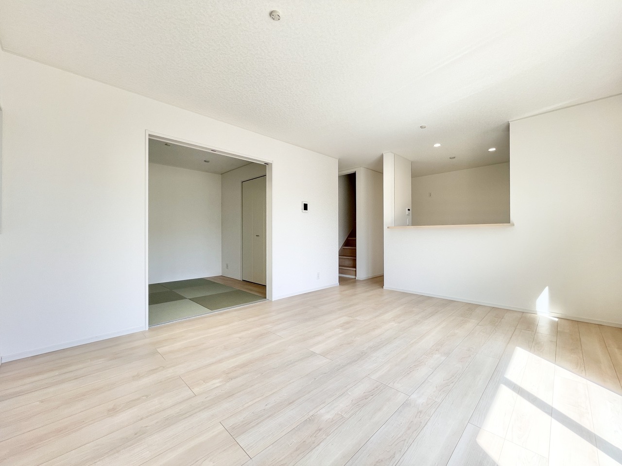 2号棟 明るい光がたっぷり差し込む広々リビングは、家族みんながのびのび過ごせる心地よい空間。キッチンや階段への動線もスムーズで、毎日の暮らしがもっと快適に。自然と会話が生まれる、あたたかい住まいです。