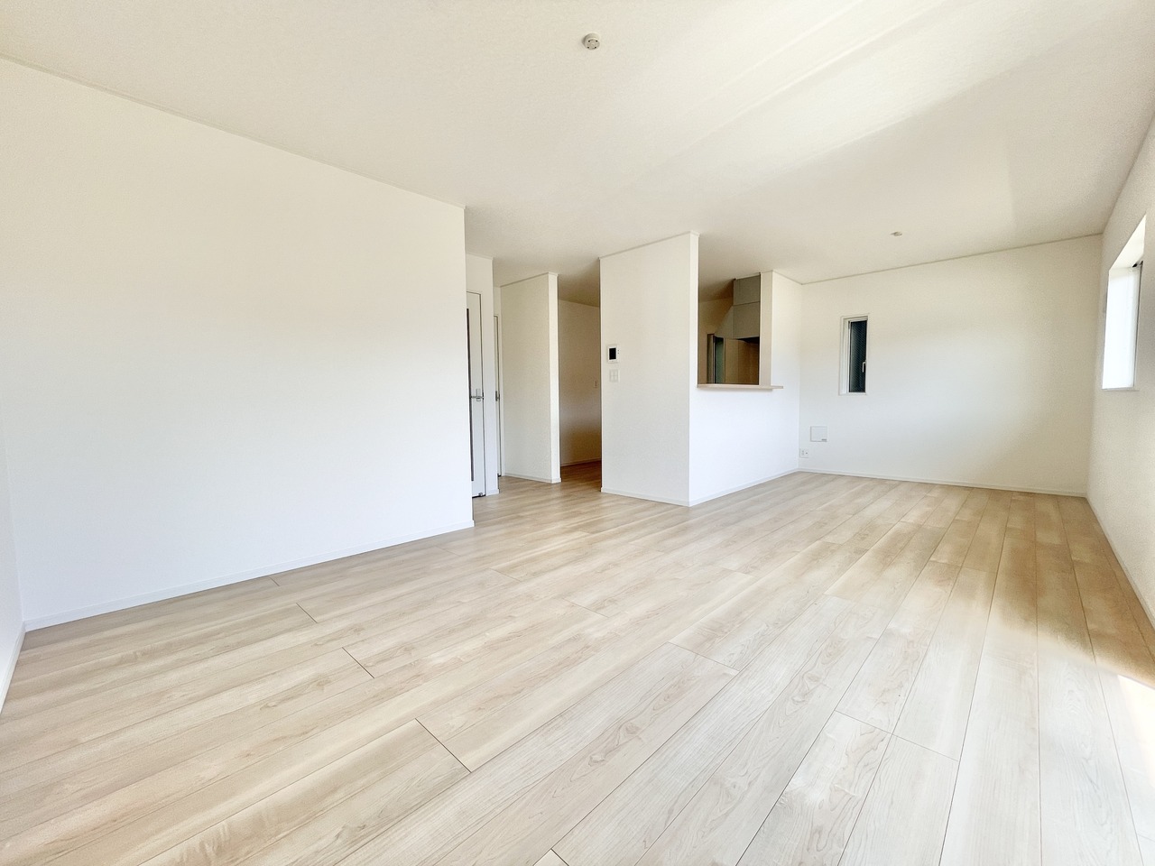 1号棟 木のぬくもりを感じる天井と白を基調とした内装が調和したリビングダイニング。落ち着きのあるデザインで、家具の配置もしやすいシンプルな空間です。