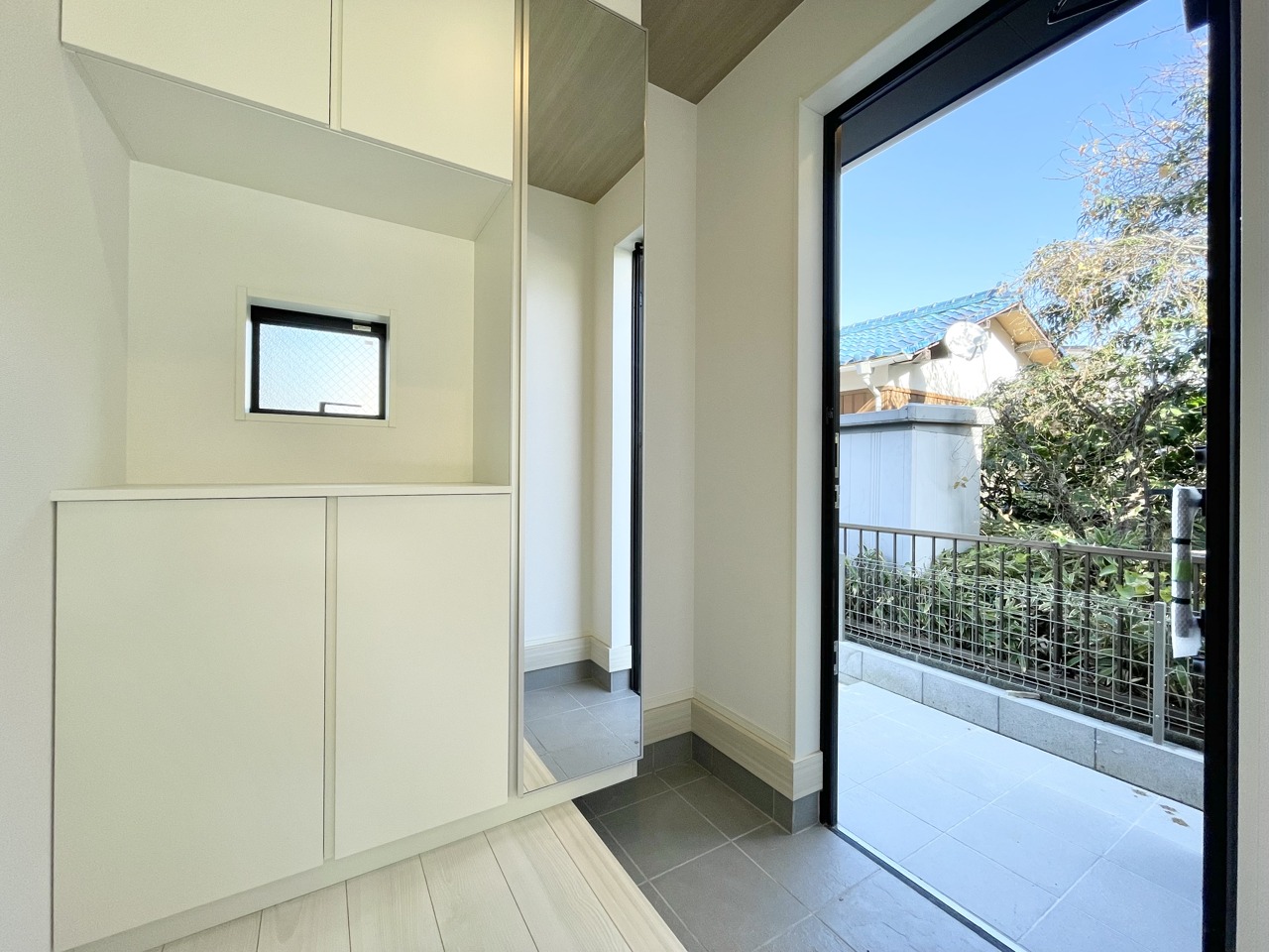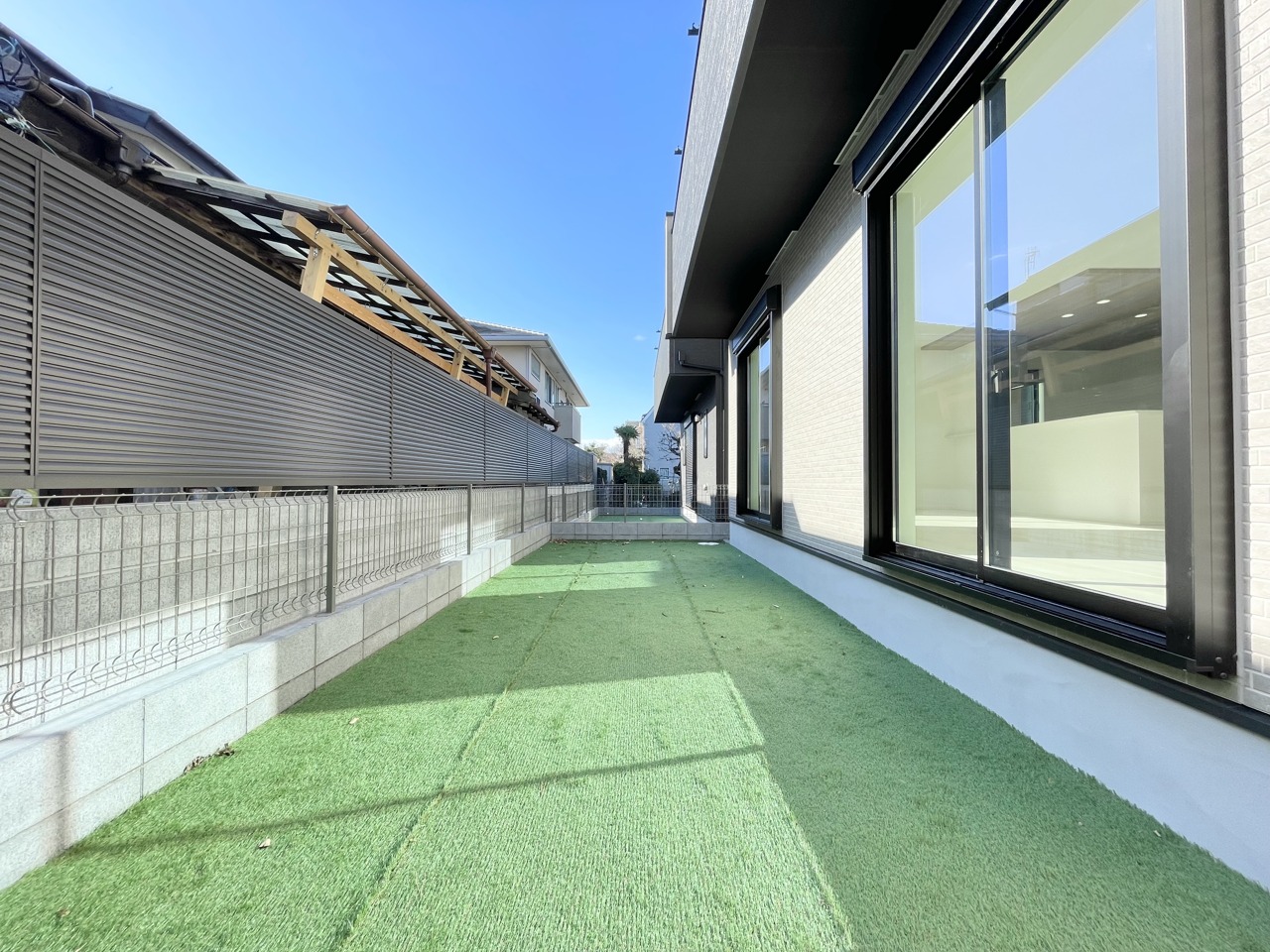 3号棟 LDK前は庭先となっており、窮屈感がなく開放的に感じられます。約42坪の敷地でゆとりあるスペース