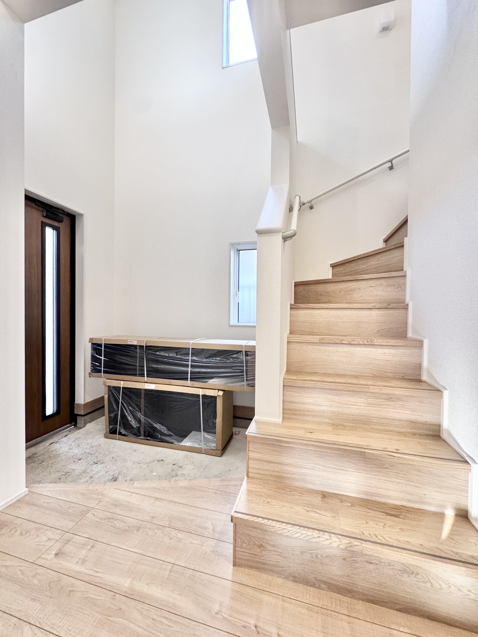 開放的な玄関スペース。玄関には吹抜けがあり、暗くなりがちの玄関が朝から心地よい陽光が射します。