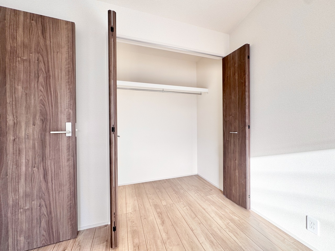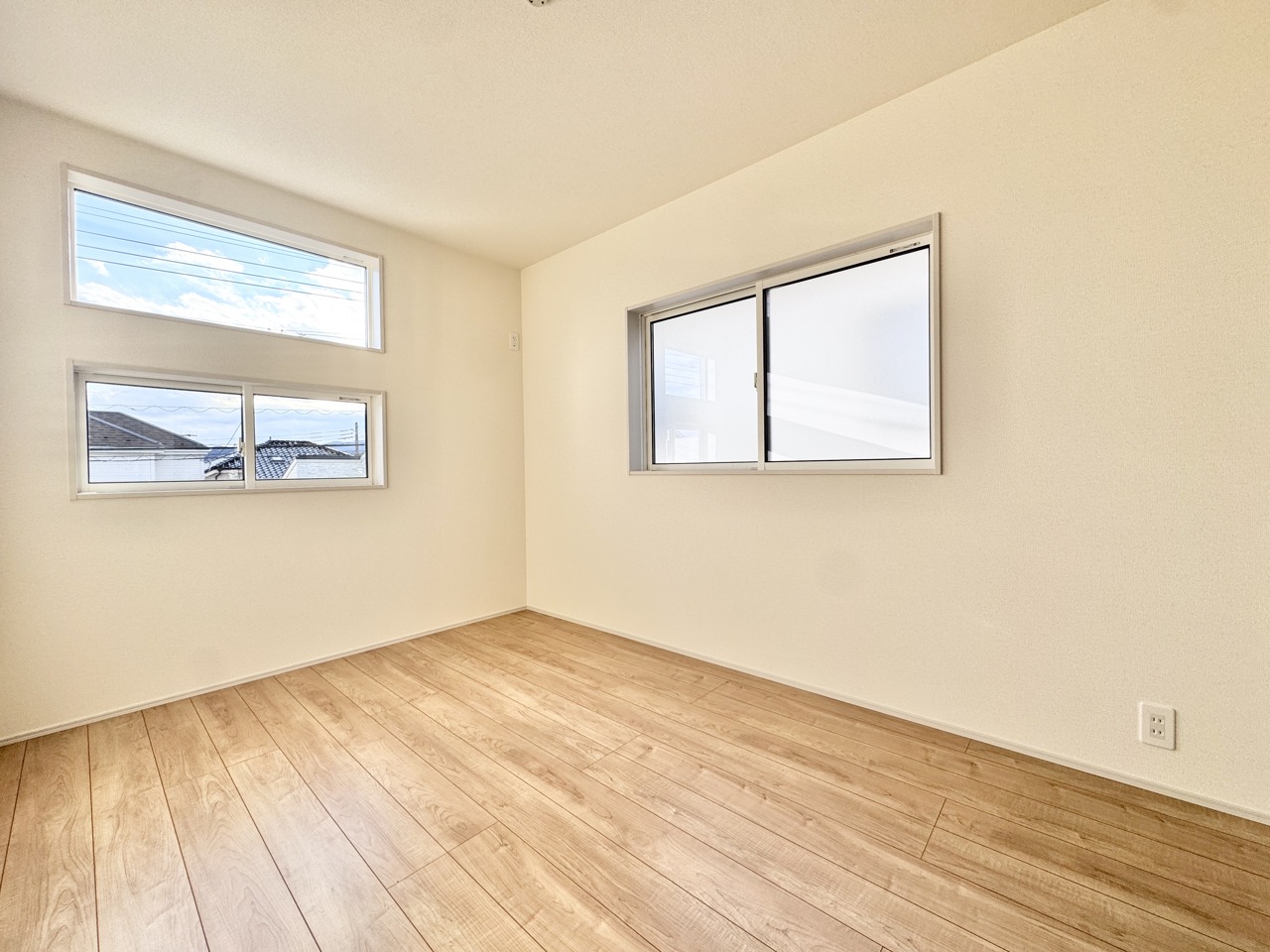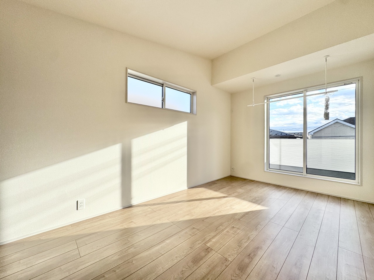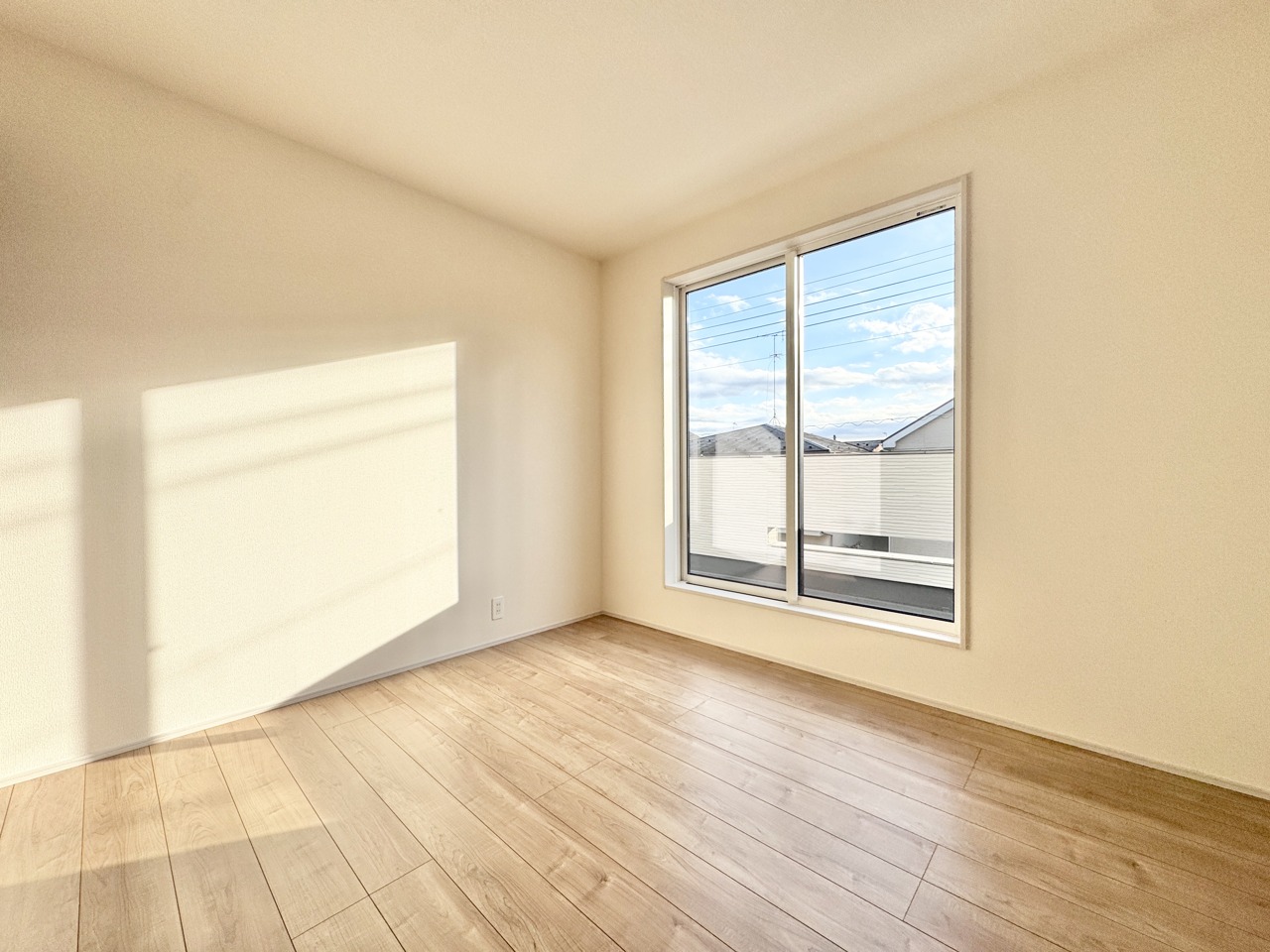 2階5.5帖の洋室。バルコニーに面して開放感があります。全室南向きの陽当たり良好の新築