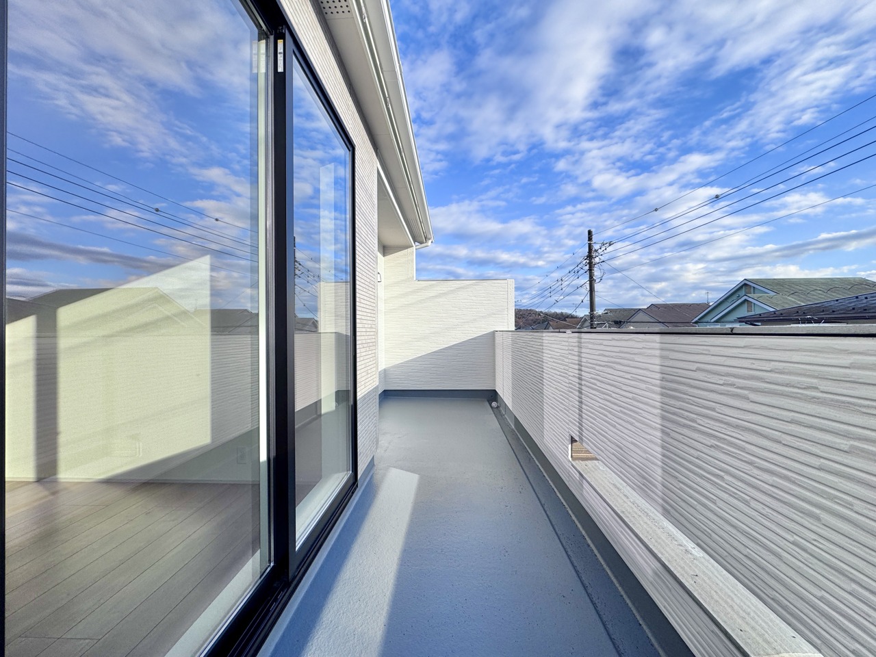 2部屋から行き来が可能なワイドバルコニー。横幅縦幅ともにゆとりあがあります。南向きで洗濯物も良く乾きそうです。