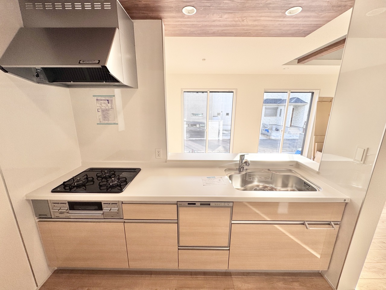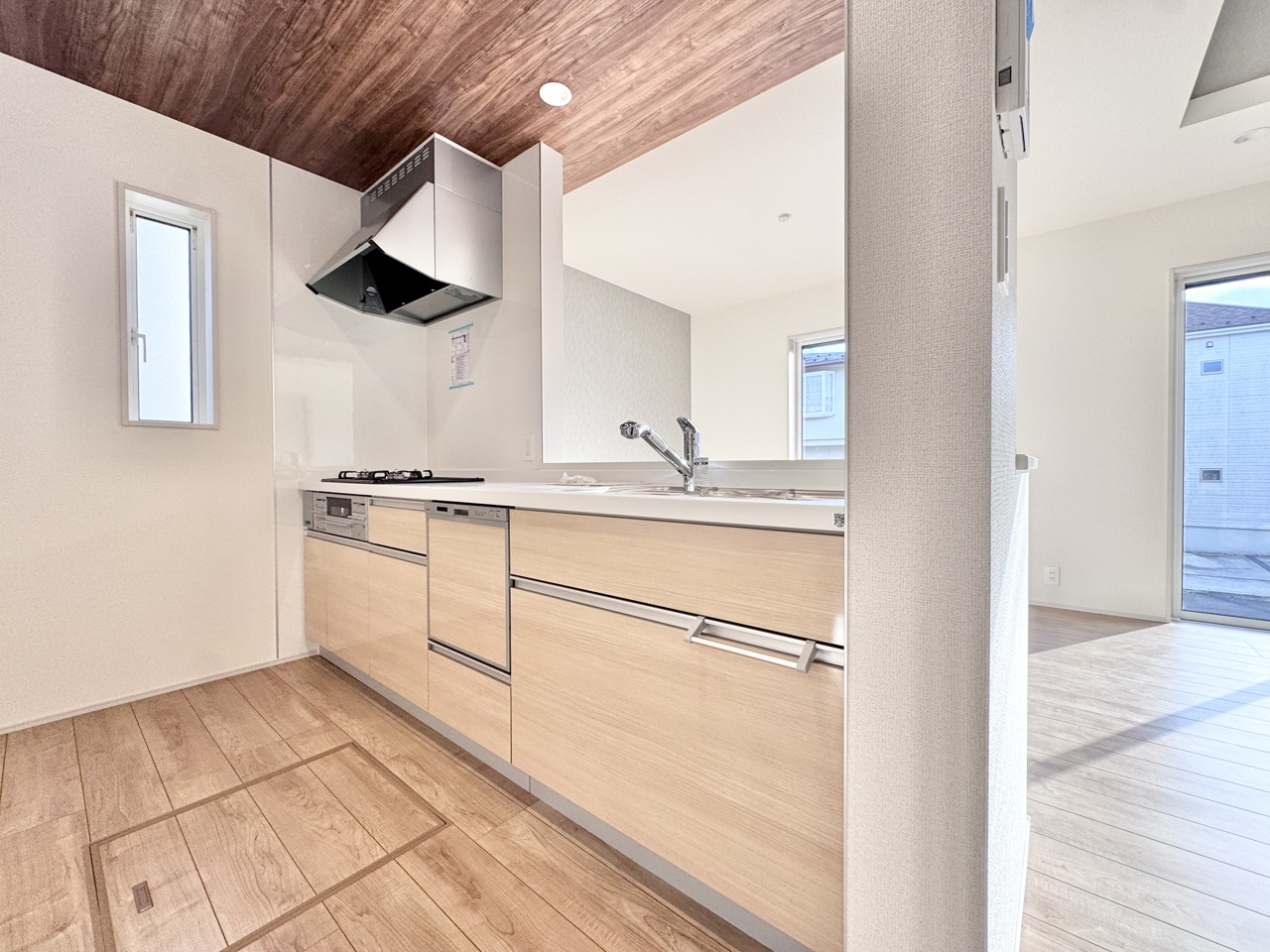 対面式システムキッチン。食洗器や床下収納、お洒落なポップアップ天井があるキッチン。