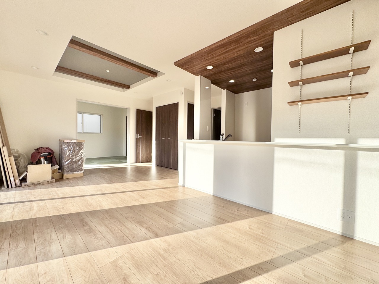LDKには稼働棚やアクセントクロス、折り上げ天井で3面採光など魅力が溢れます。