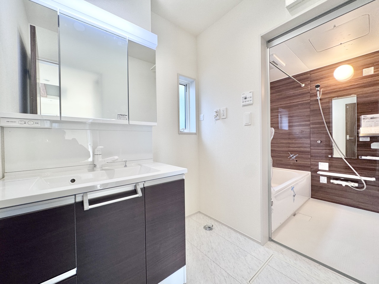 ゆとりあるスペースの洗面化粧台スペース。忙しい朝に活躍