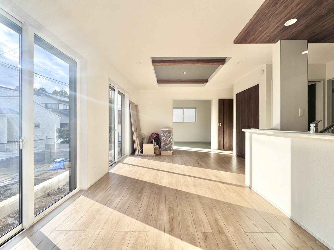 LDKは約16帖で折り上げ天井があり開放感良好です。1階5.5帖の和室と合わせると20帖以上の空間で広々と感じられます。
