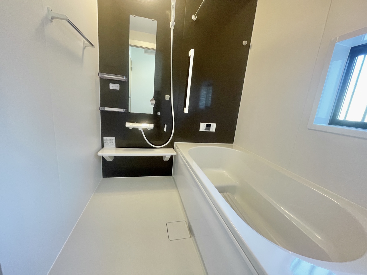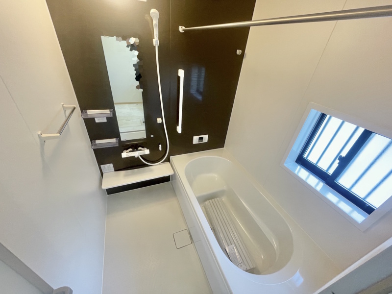 窓付きの浴室暖房換気乾燥機付きバスルーム。一日の疲れを癒すバスルーム