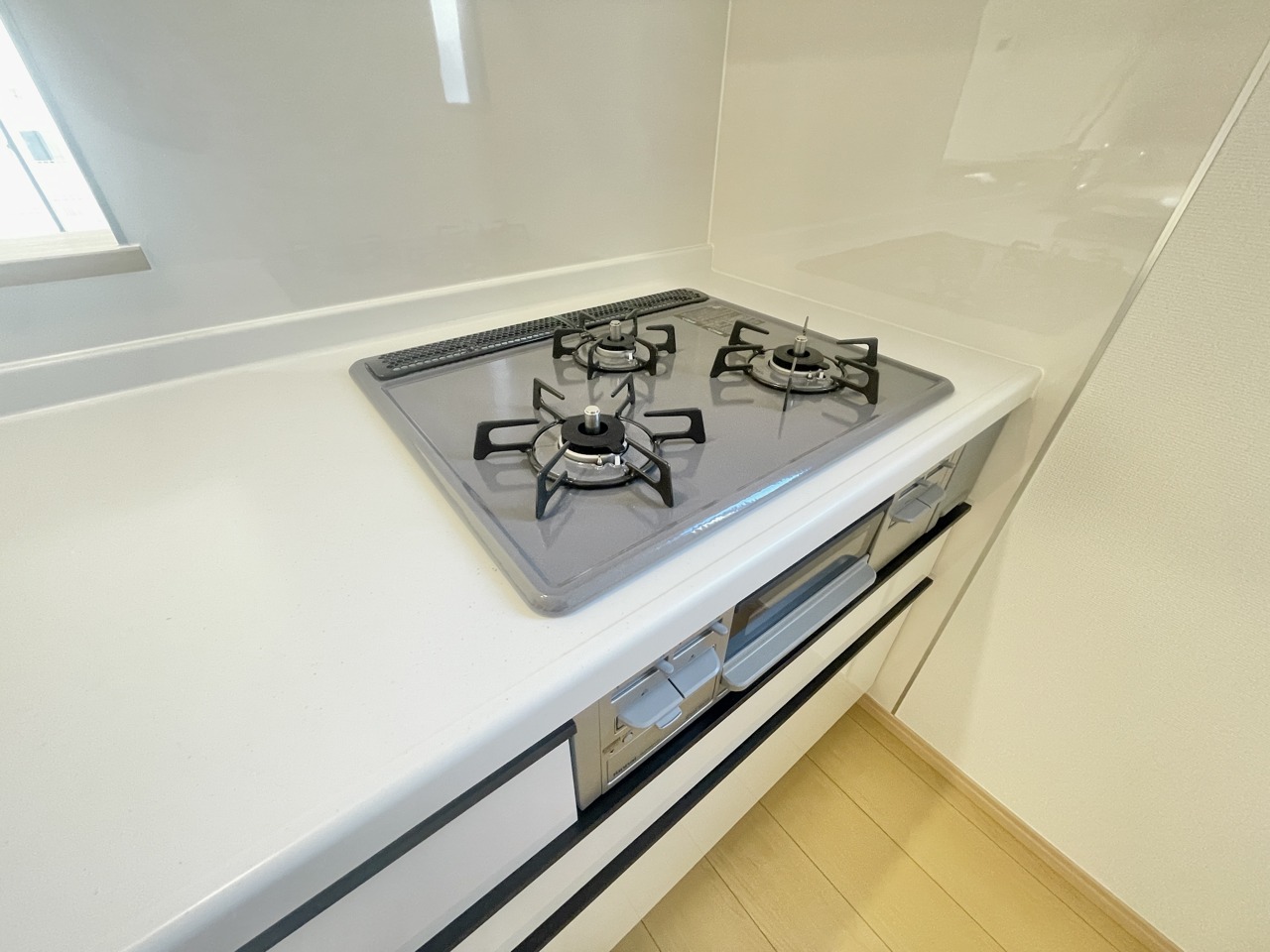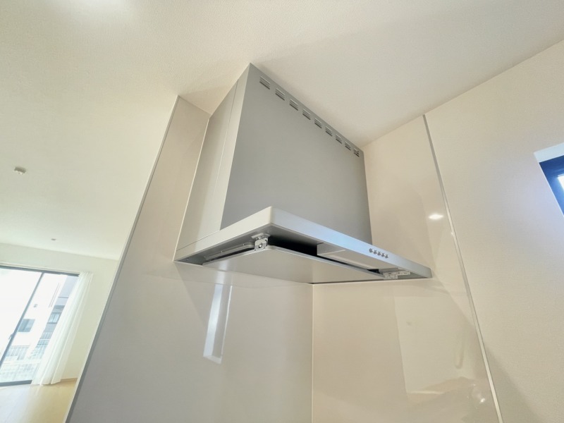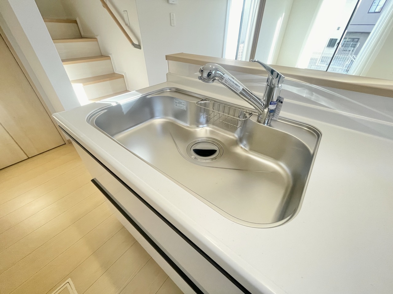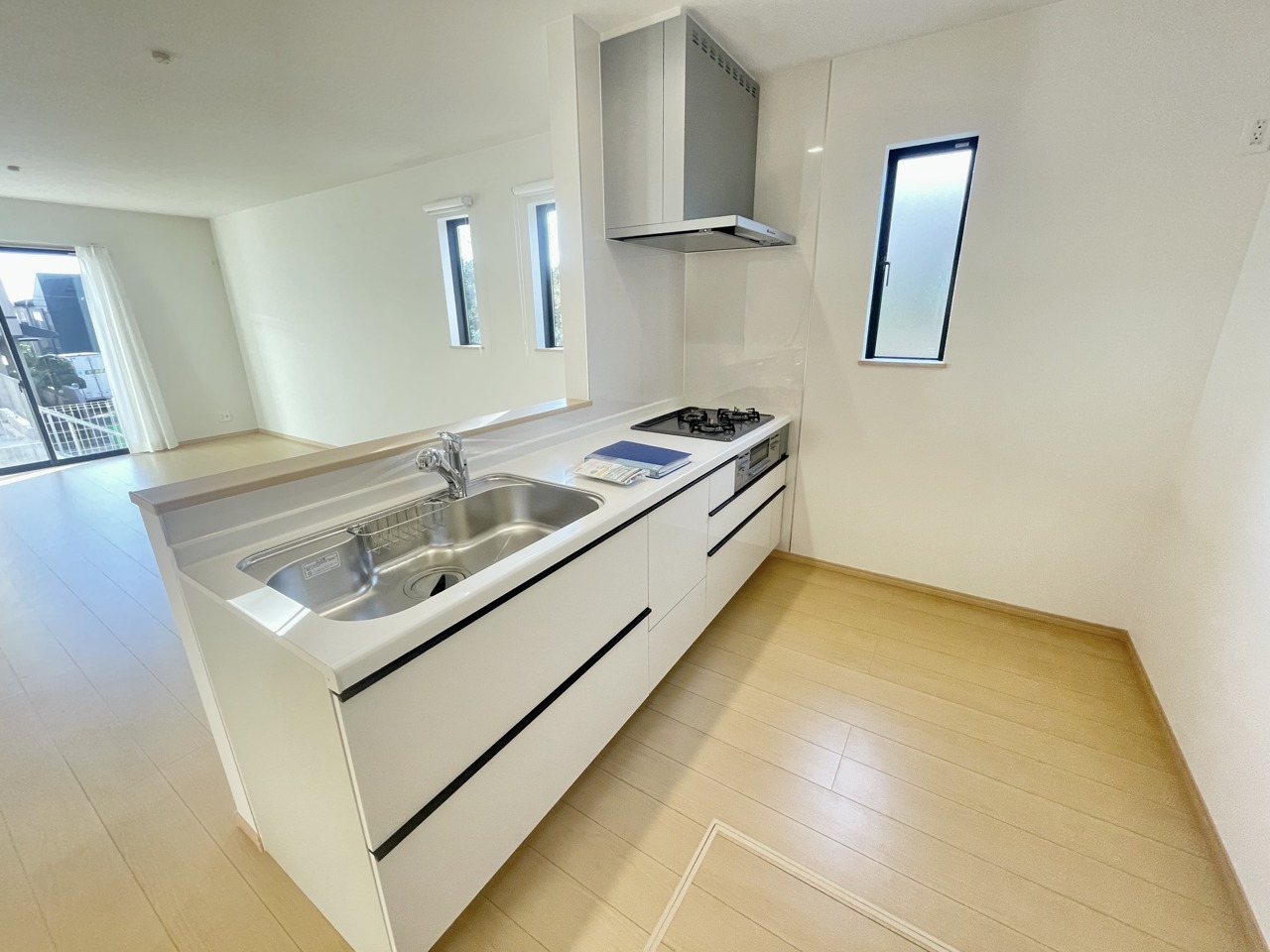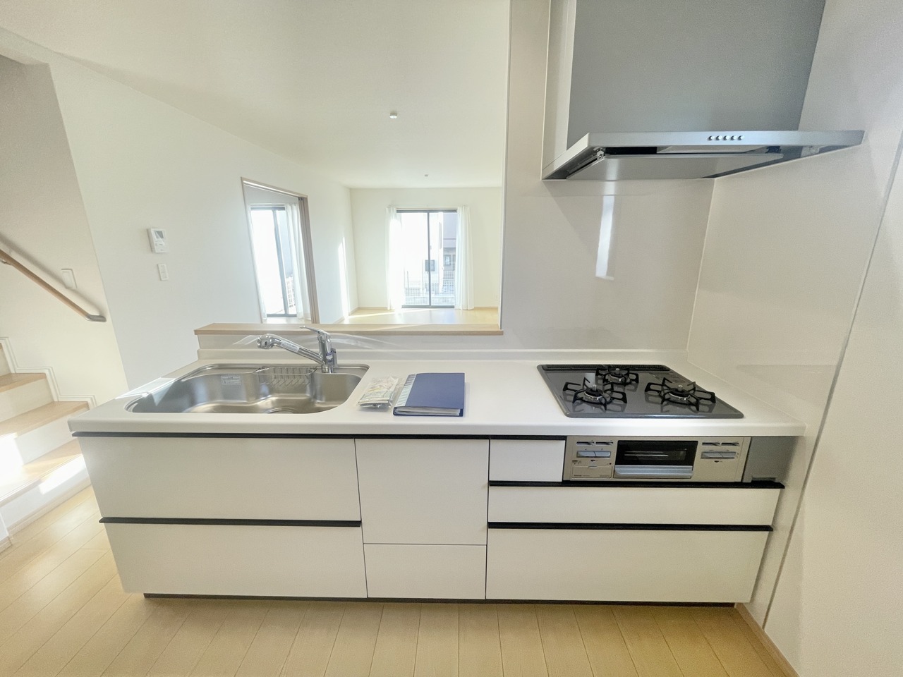 開放感ある対面式システムキッチン。左手側には収納もあり荷物が多くなりがちのキッチンをすっきりできそう。