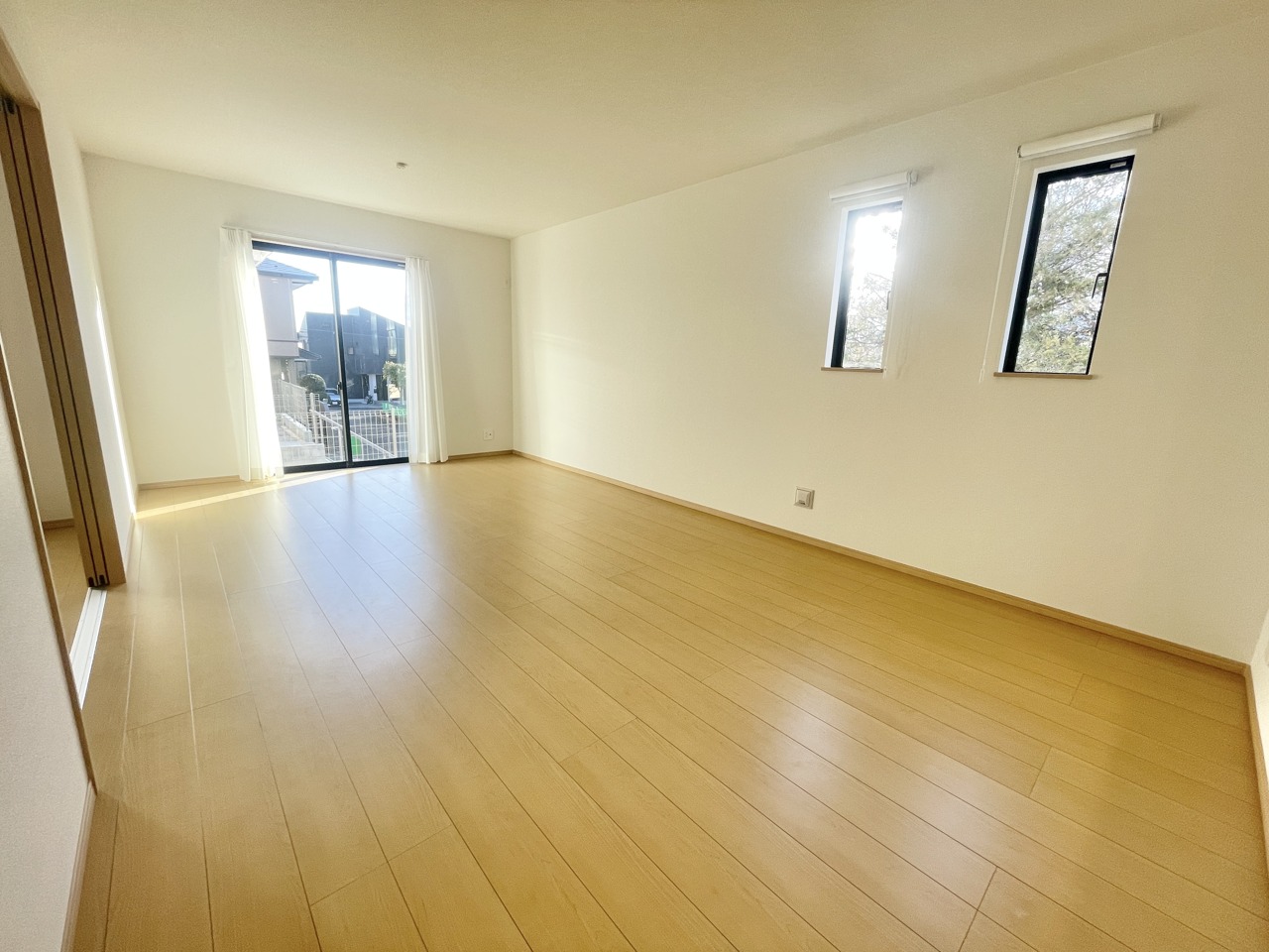 2階約8帖の主寝室。2面採光で南側のワイドバルコニーと面しており陽当たりと開放感が良好が良好です。