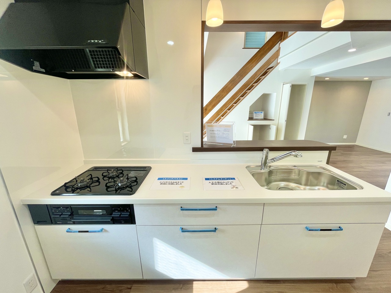新規取り換え済みの対面式システムキッチン。まずは一度現地をご覧になってみてください。