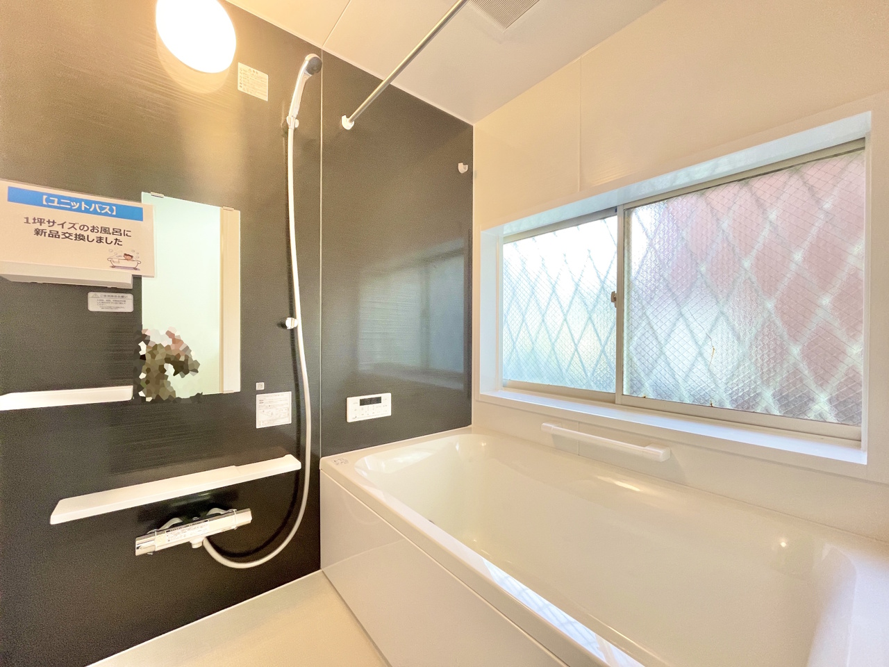 大きな窓付きの浴室暖房換気乾燥機付きバスルーム。一日の疲れを癒してください。