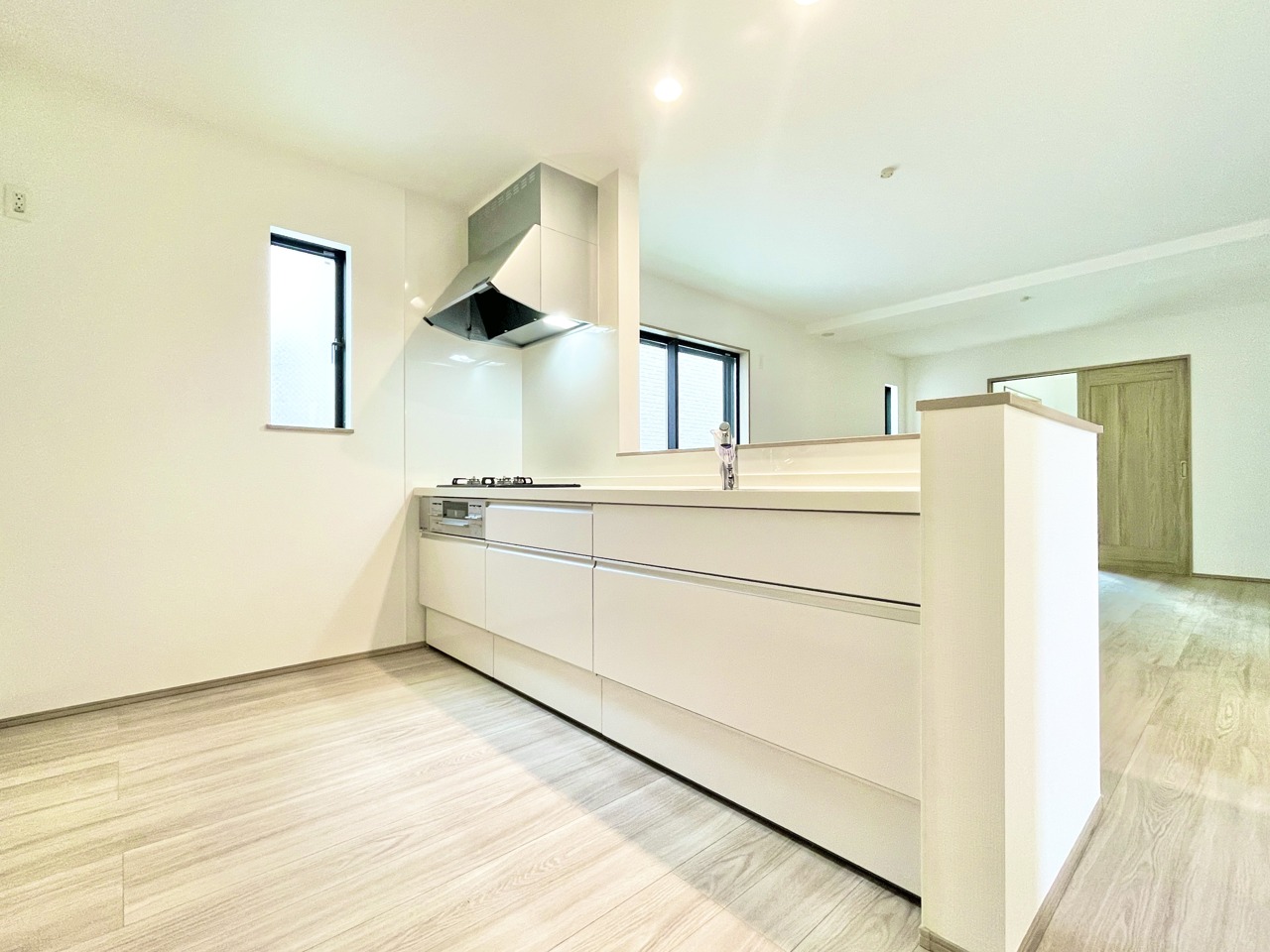 【モデルルーム】開放感ある対面式セミオープンシステムキッチン。パントリーもあり収納も豊富です。