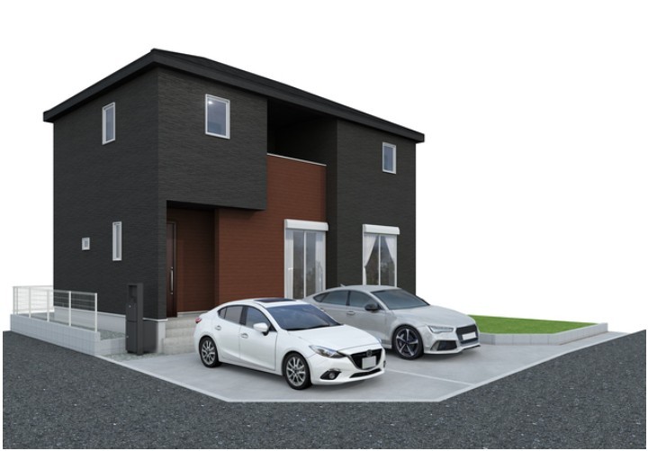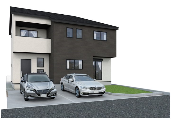 1号棟 完成予想パース。南東道路と南西道路の角地なので、陽当たりと開放感、通風は良好です。