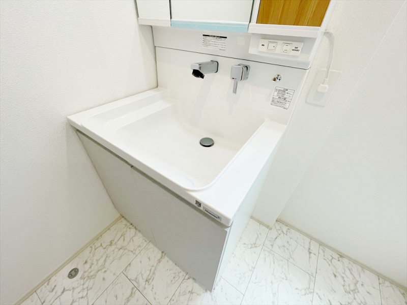 三面鏡は真正面から見ただけでは気付けない色んな角度から確認でき、収納スペースが豊富であるということがメリットです。また、シャワーヘッド付きの水栓です。ミラー扉の内側がすべて収納スペースになっています。