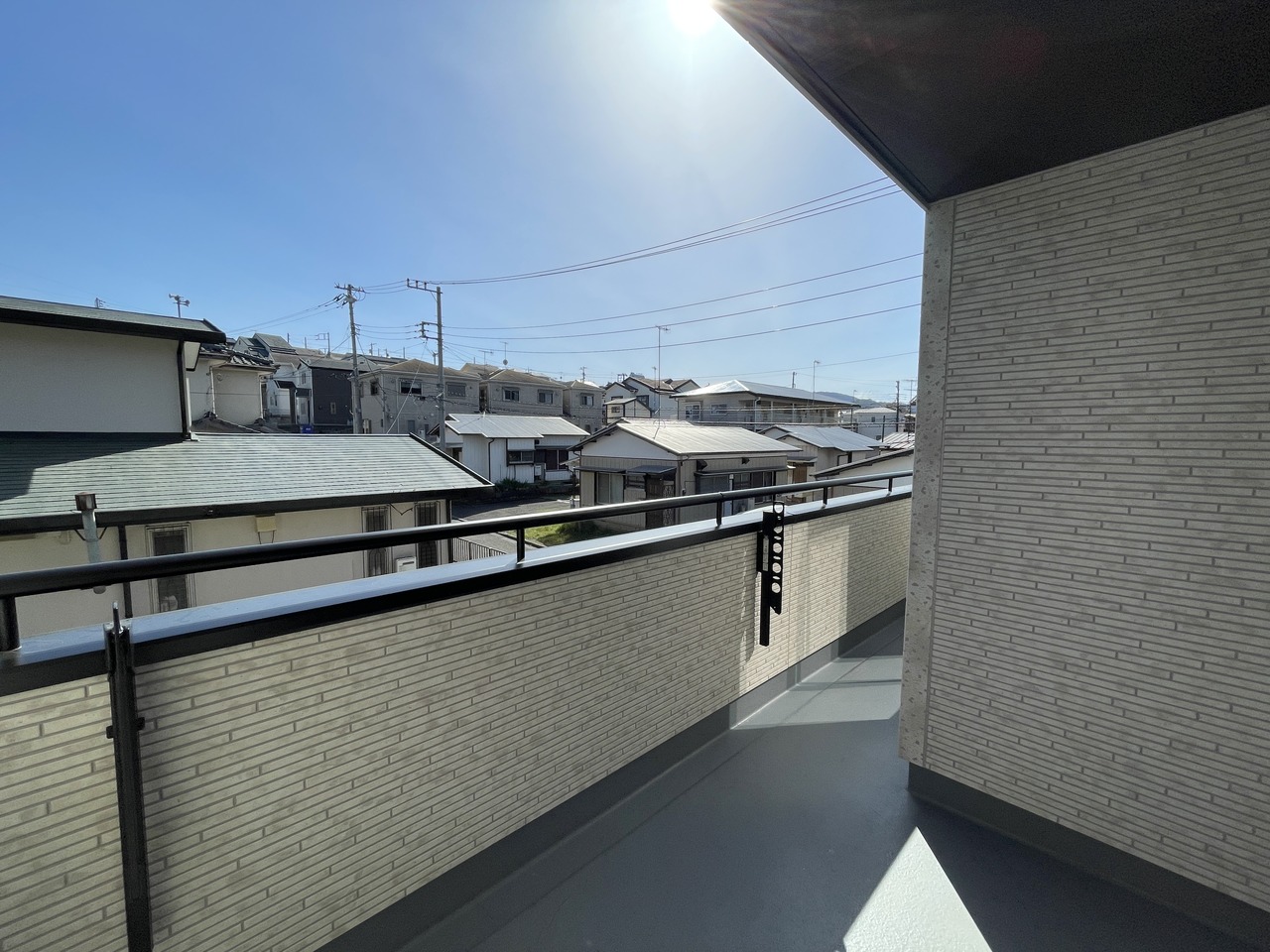 たっぷりと陽が入るバルコニーは、洗濯物がよく乾くだけでなく、外の開放感を感じながらリラックスできる空間です。 柵がしっかりとした造りで安心感があり、隣室からそのまま出入りできる使い勝手の良い仕様。 バルコニーからは周辺が見渡せ、圧迫感のない眺望が魅力です。