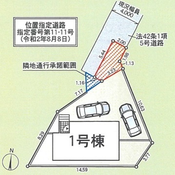 | 土地面積 | 143.4m² 実測 (私道22.25m²別に有、私道持分比率:1/2、協定通路部分(路地状部分)約11.26平米を含む。) | ||