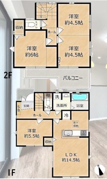 | 間取 | 3LDK (洋室5.5帖、LDK14.5帖、洋室6帖、洋室4.5帖、洋室4.5帖) | ||