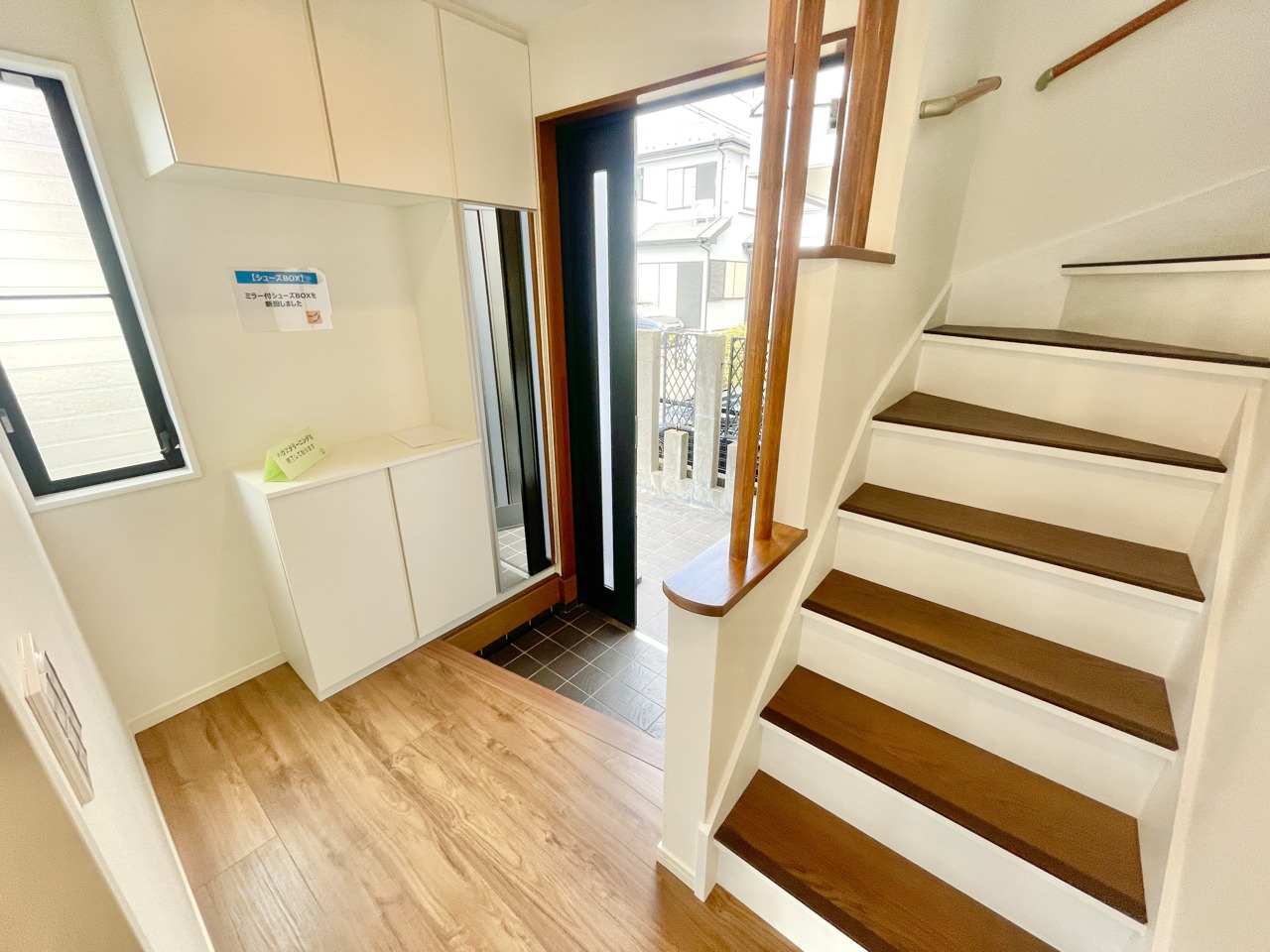 ゆとりある空間の玄関スペース。シューズボックスも容量が大きいため靴の収納には困らなそうです。