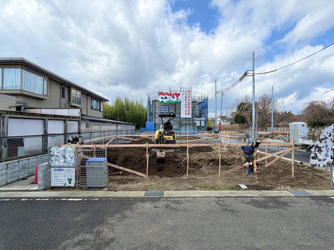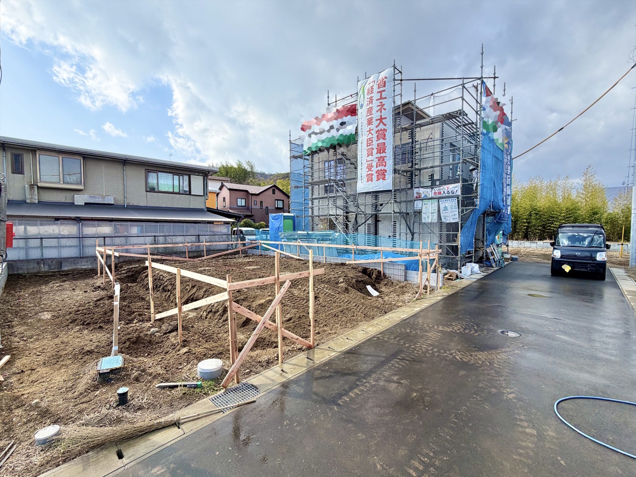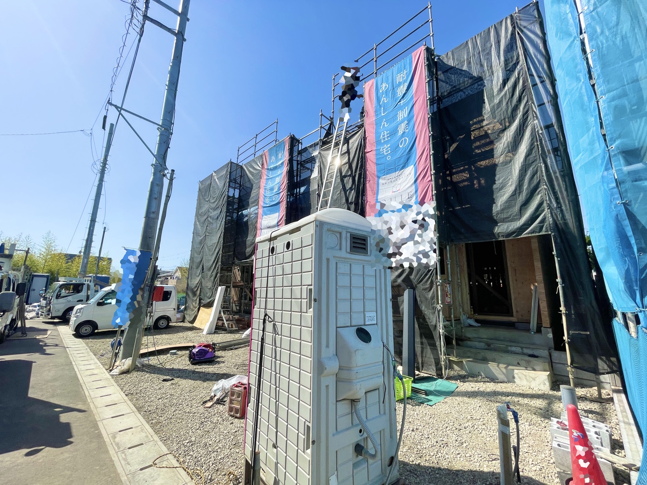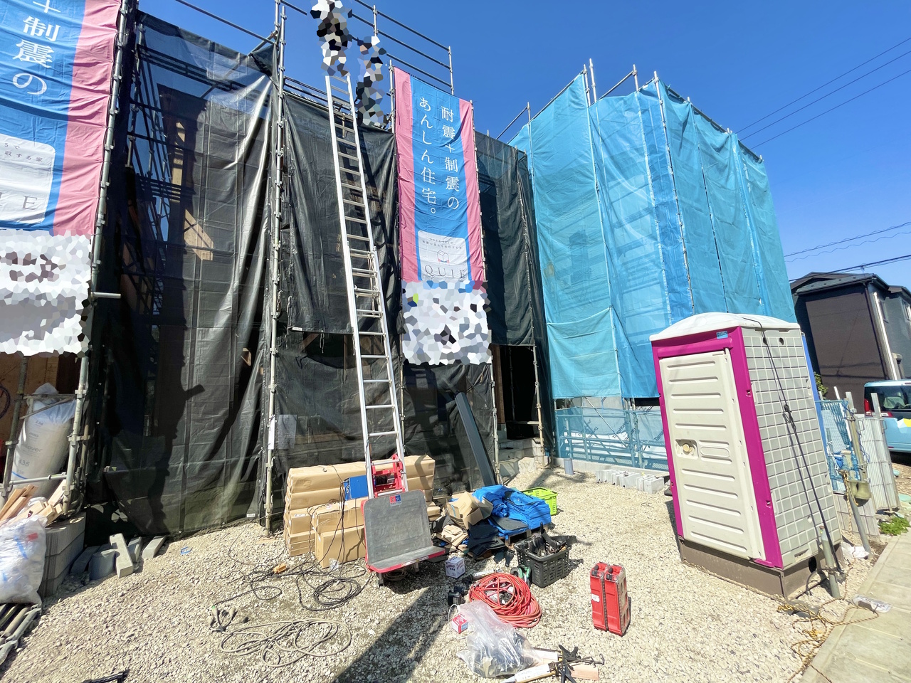 2号棟 青空に映える建築中の住まいは、耐震+制震の安心仕様。落ち着いた住宅街で、暮らしやすさと静けさを両立できる環境です。これから形になる新しいお家で、家族の“ちょうどいい毎日”を育んでみませんか?完成が楽しみになる一邸です。