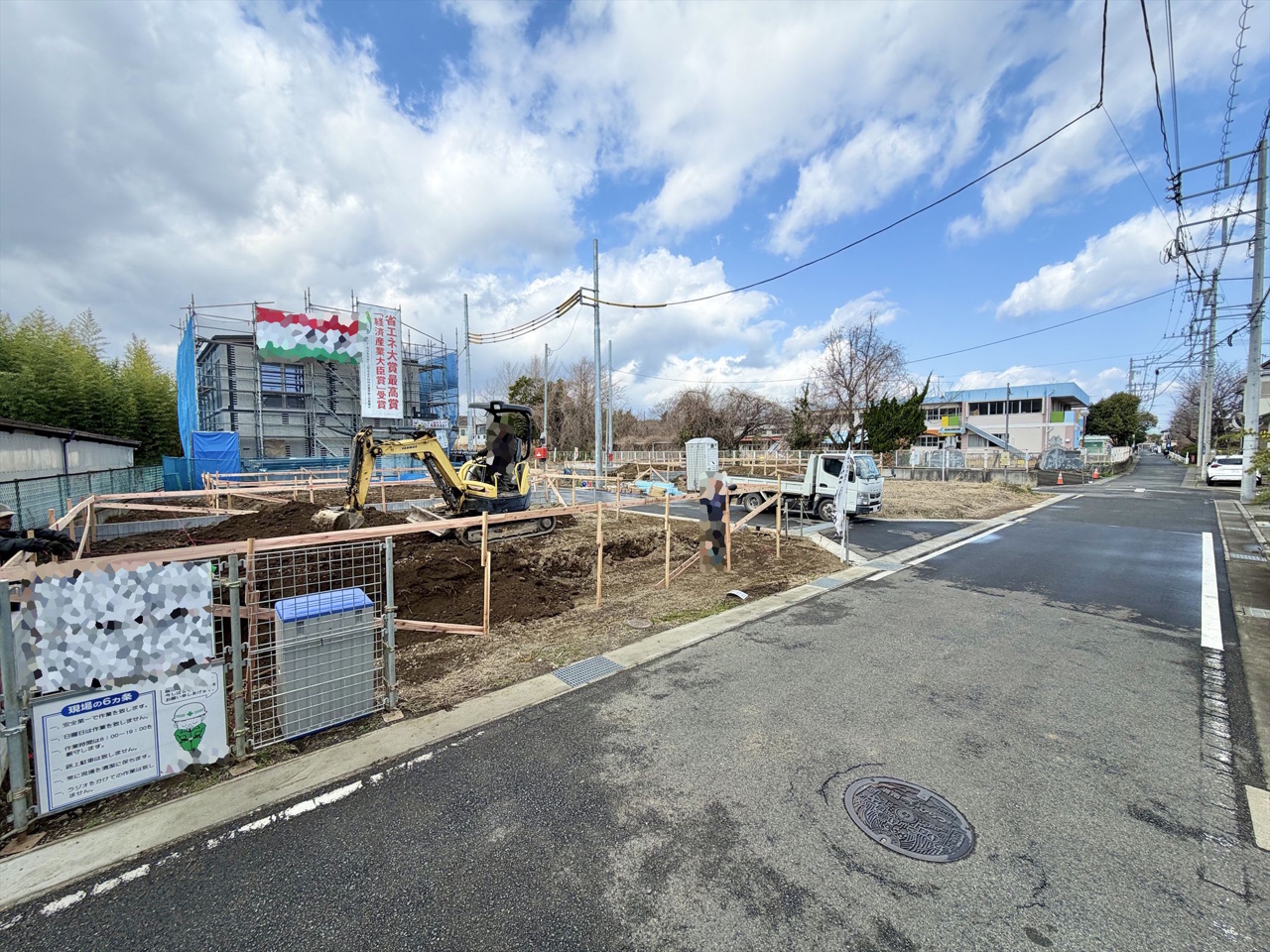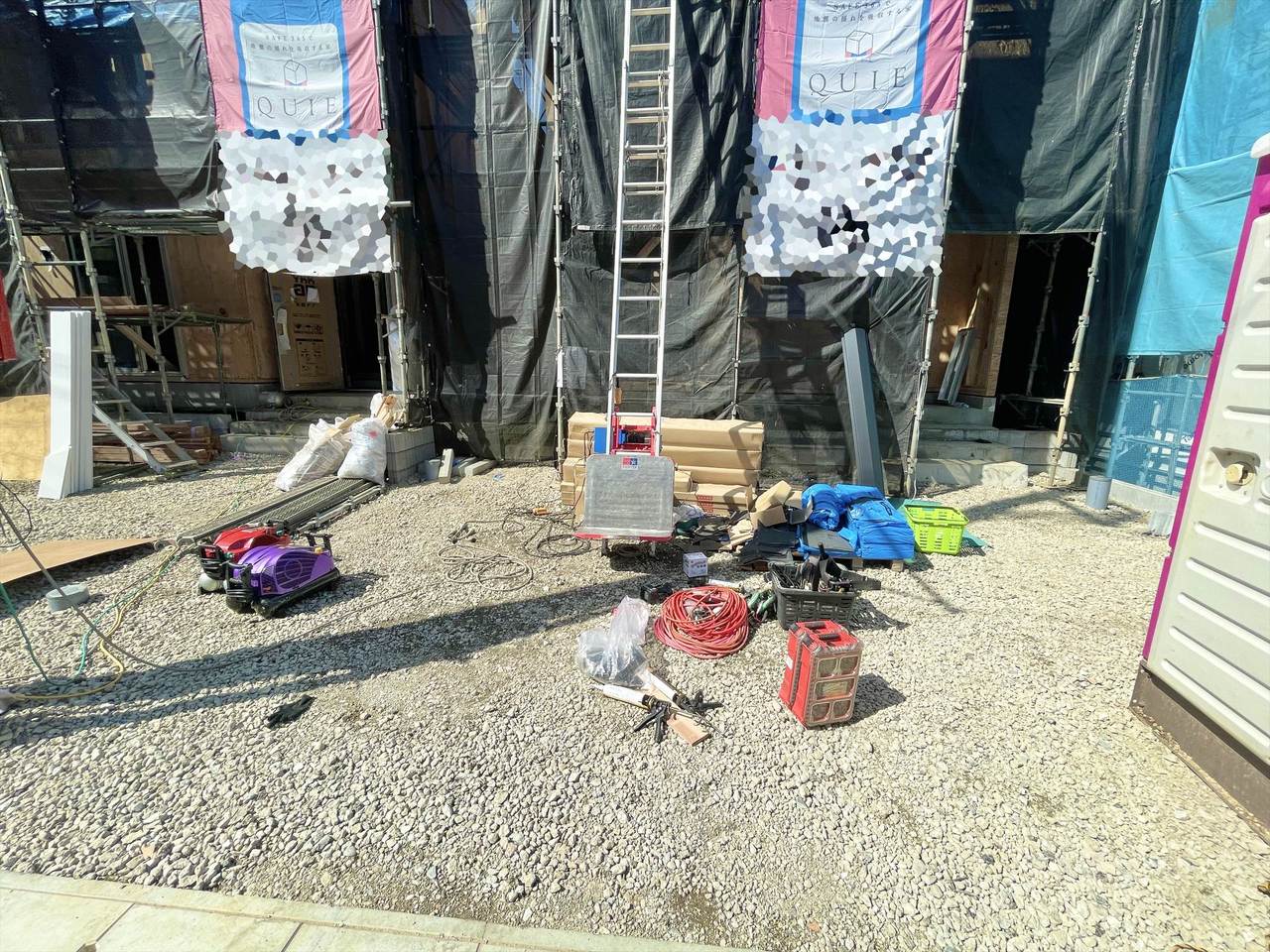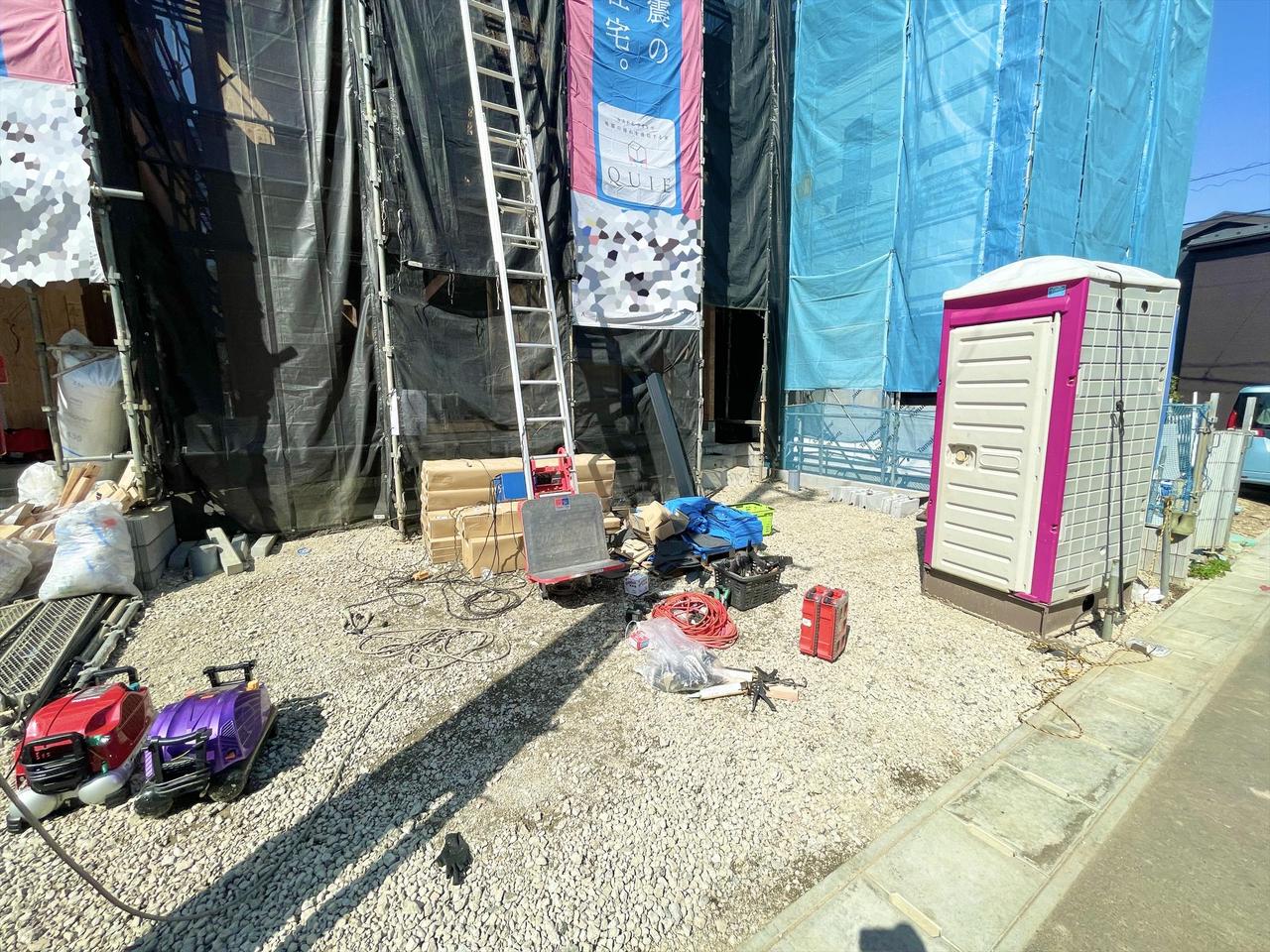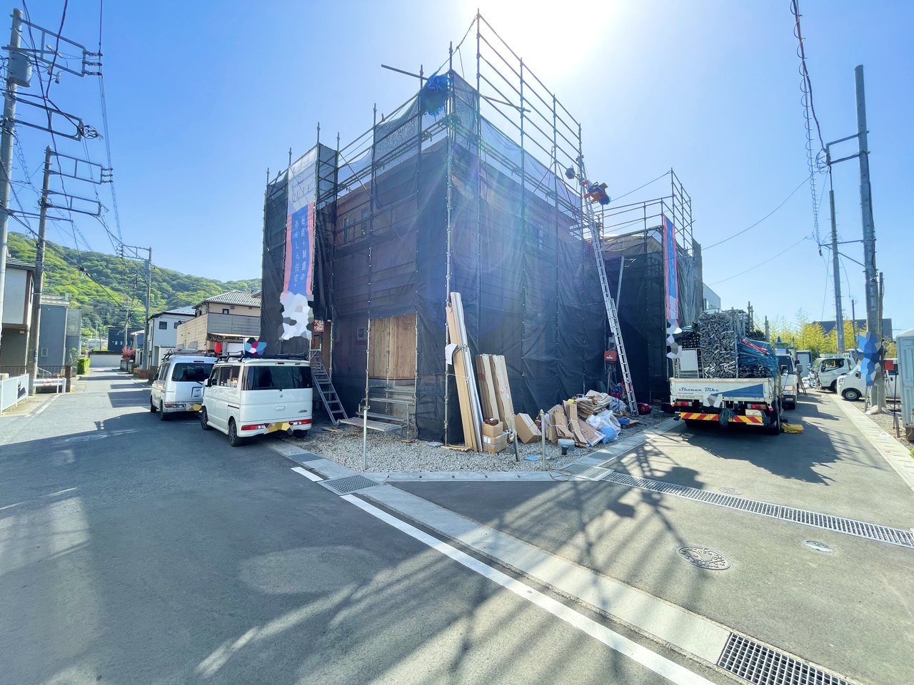 2号棟 青空に映える建築中の住まいは、耐震+制震の安心仕様。落ち着いた住宅街で、暮らしやすさと静けさを両立できる環境です。これから形になる新しいお家で、家族の“ちょうどいい毎日”を育んでみませんか?完成が楽しみになる一邸です。