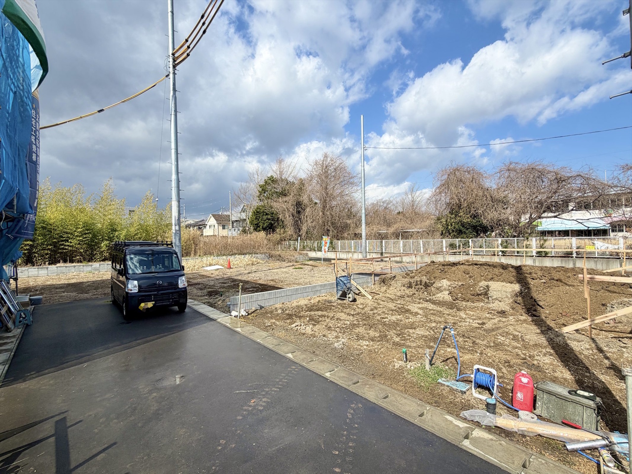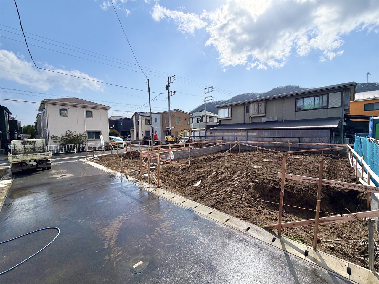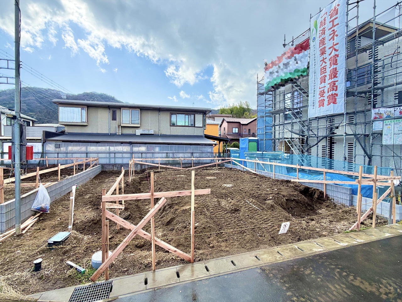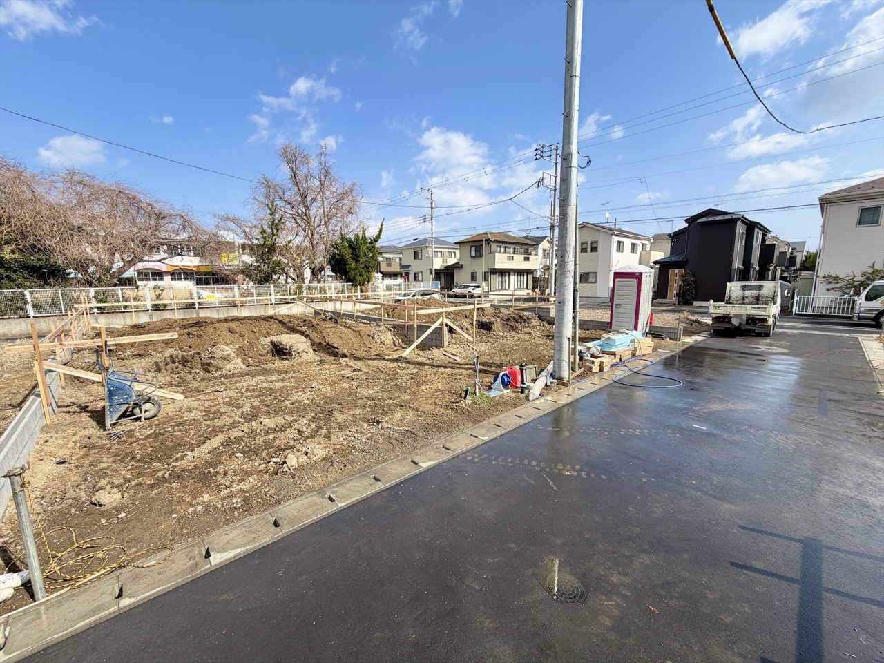 2号棟 青空に映える建築中の住まいは、耐震+制震の安心仕様。落ち着いた住宅街で、暮らしやすさと静けさを両立できる環境です。これから形になる新しいお家で、家族の“ちょうどいい毎日”を育んでみませんか?完成が楽しみになる一邸です。