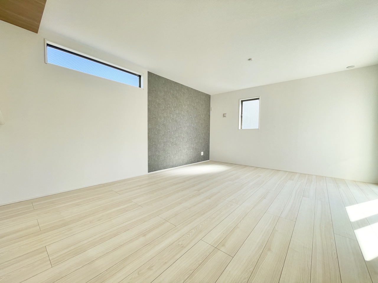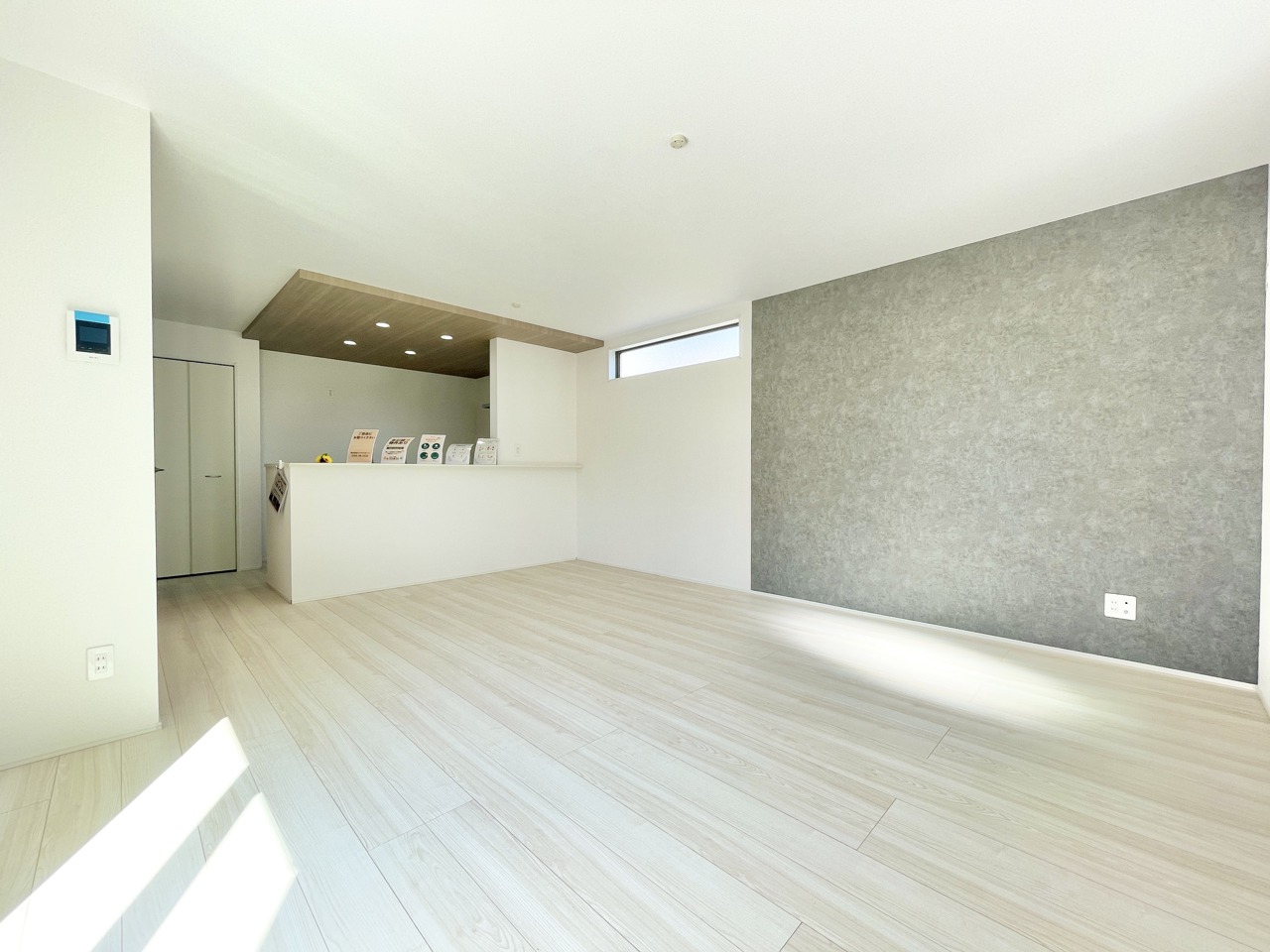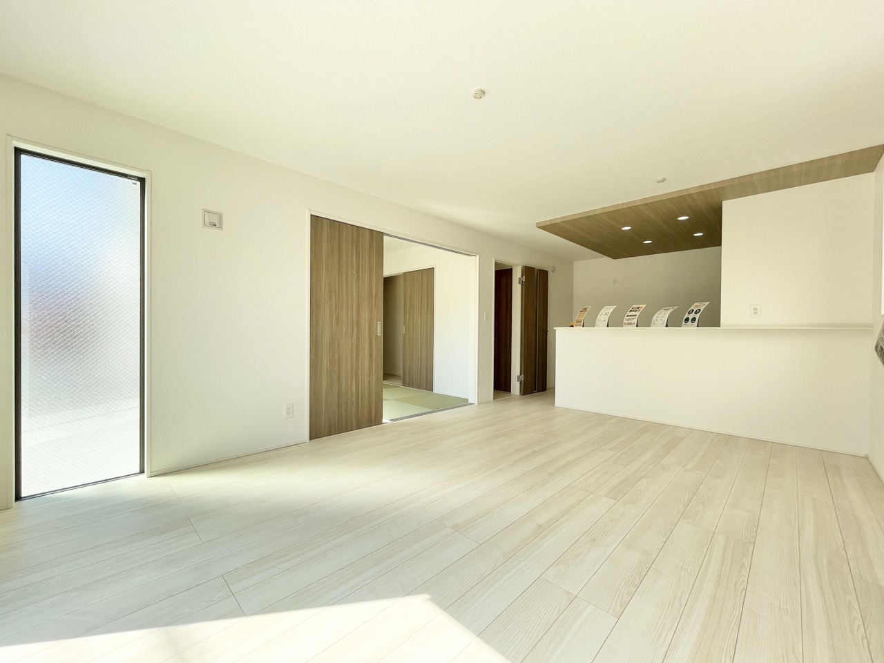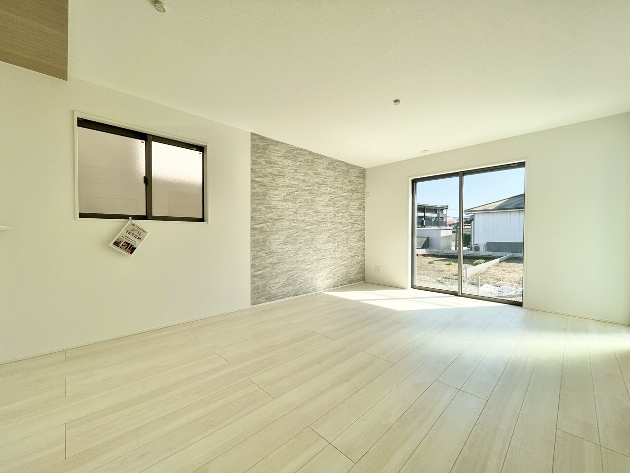 2号棟 大きな窓からやさしい光が差し込み、朝から夕方まで心地よく過ごせます。家族団らんの時間はもちろん、くつろぎや来客時にも活躍する、居心地の良い空間です。