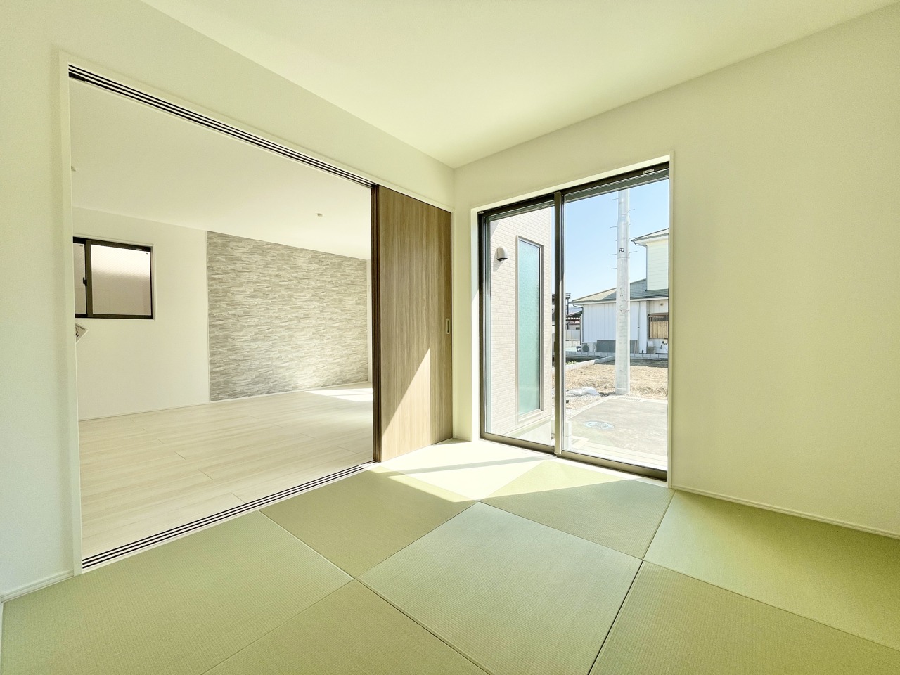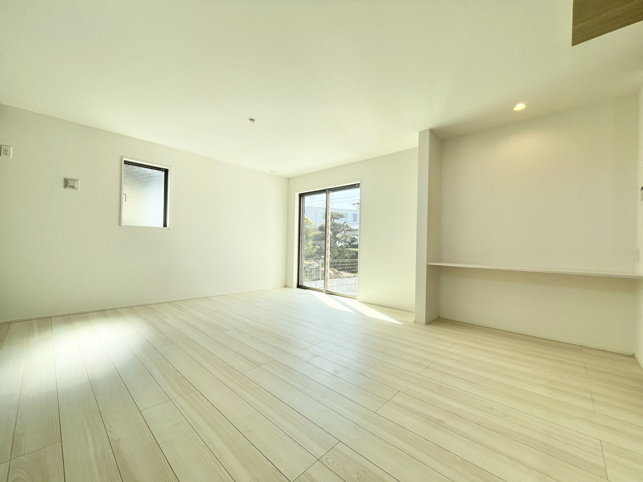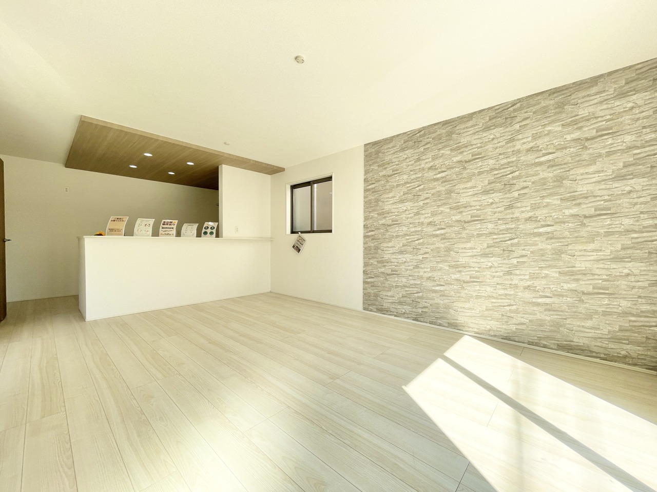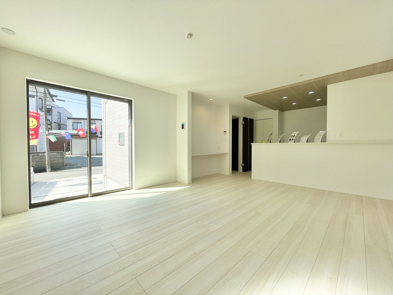 2号棟 大きな窓からやさしい光が差し込み、朝から夕方まで心地よく過ごせます。家族団らんの時間はもちろん、くつろぎや来客時にも活躍する、居心地の良い空間です。