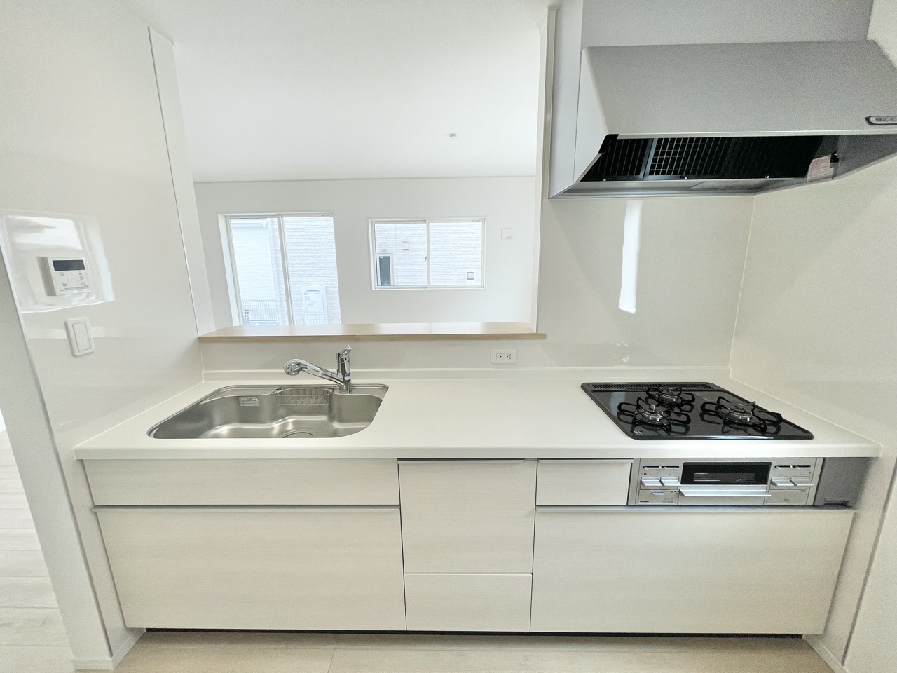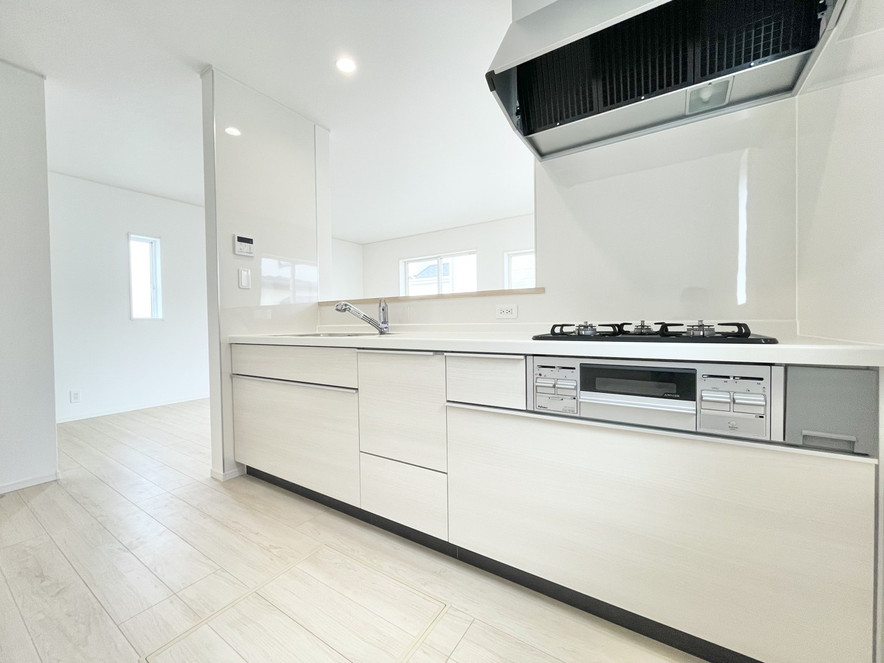 白を基調としたキッチンは、調理スペースもしっかりと確保されております。3口コンロに魚焼きグリル、お料理の幅も広がってきそうです。