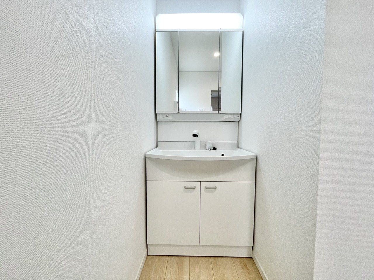 洗面台には、お支度の際に嬉しい三面鏡を採用しております。鏡裏と足元にも収納がございますので、散らかりがちな洗面台もスッキリとお使い頂けます。