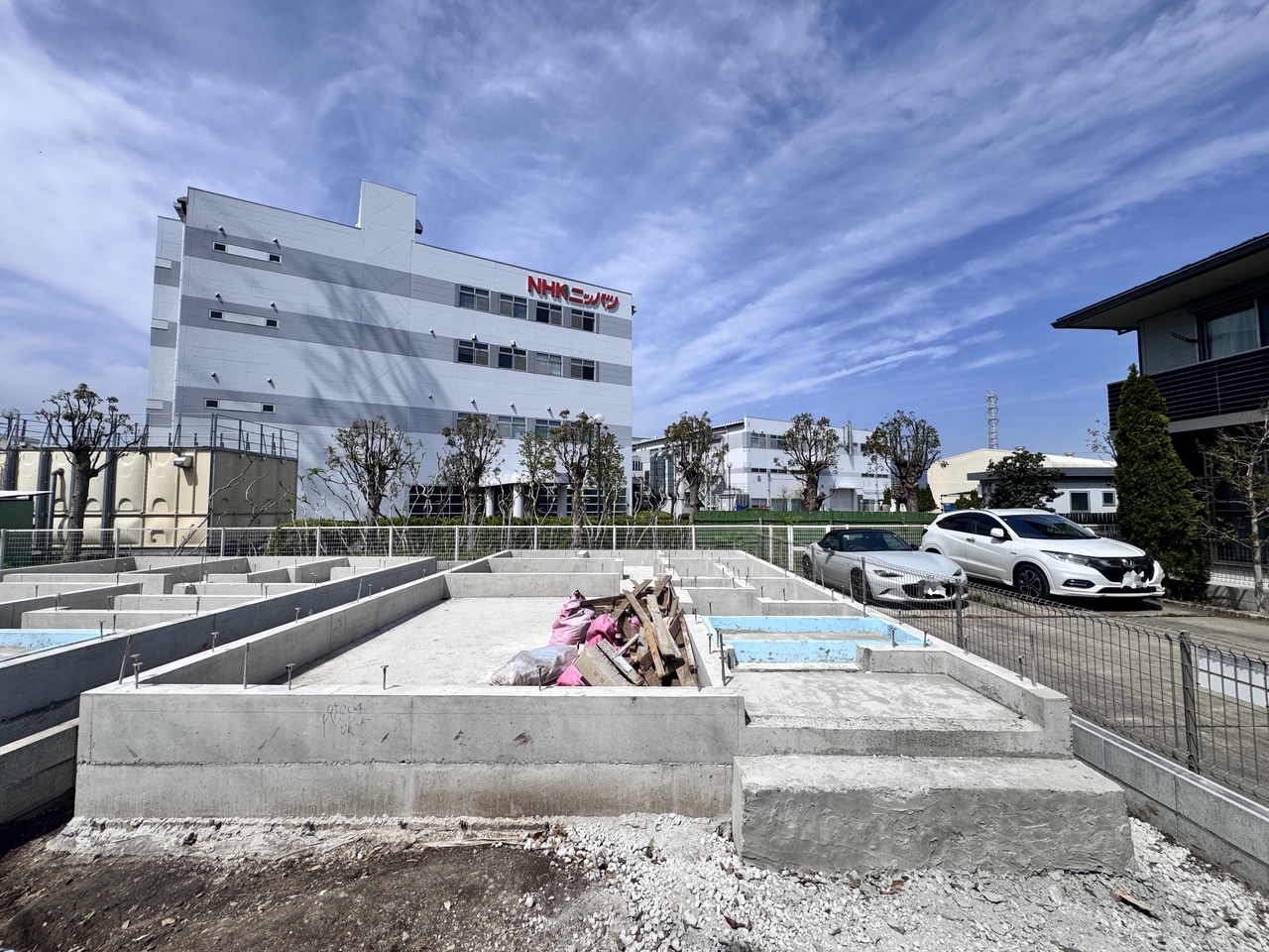 2号棟 青空に映える建築中の住まいは、耐震+制震の安心仕様。落ち着いた住宅街で、暮らしやすさと静けさを両立できる環境です。これから形になる新しいお家で、家族の“ちょうどいい毎日”を育んでみませんか?完成が楽しみになる一邸です。