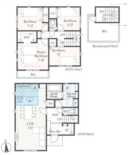 | 間取 | 4LDK (LDK17帖、洋室7.4帖、洋室5.3帖、洋室5帖、洋室4.5帖) | ||